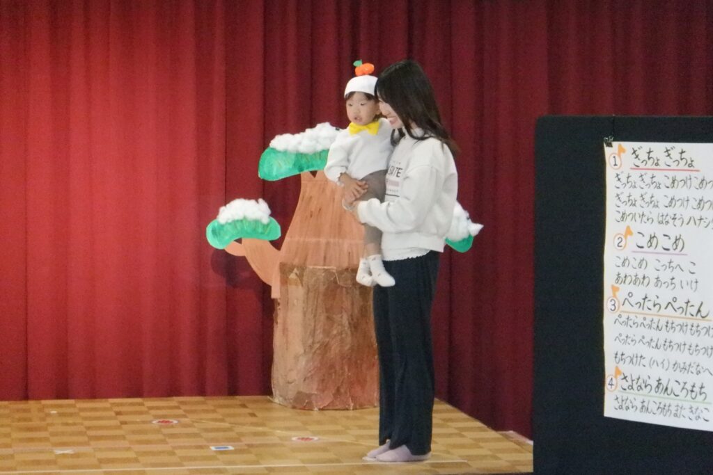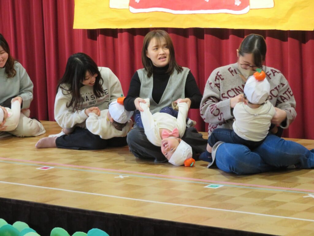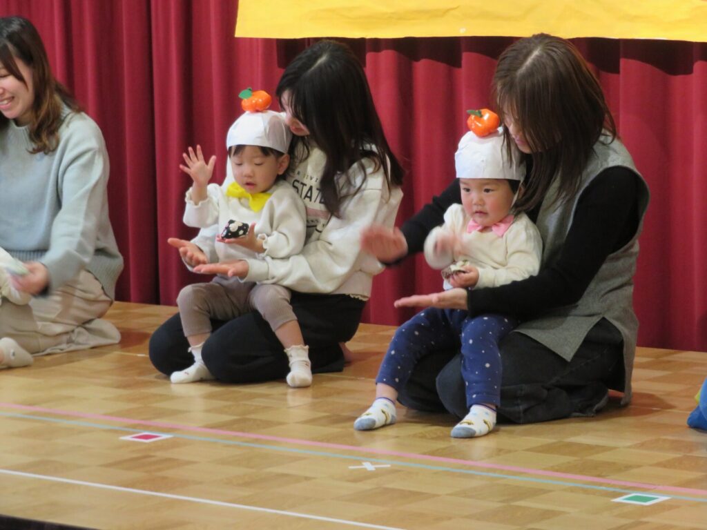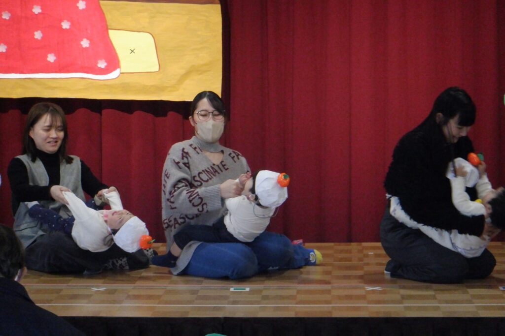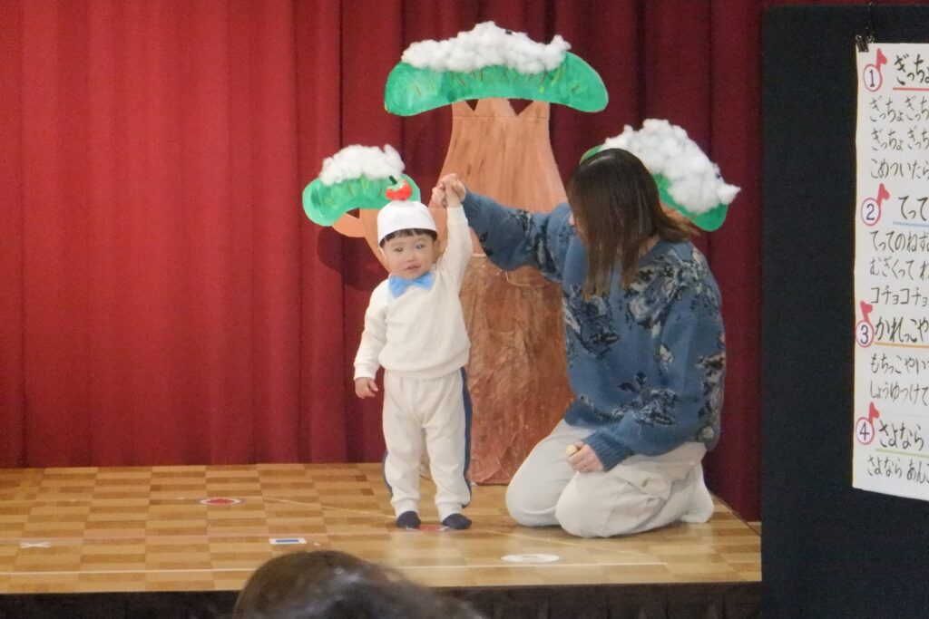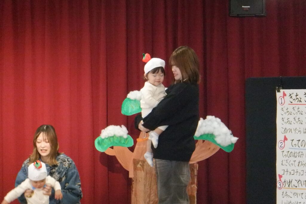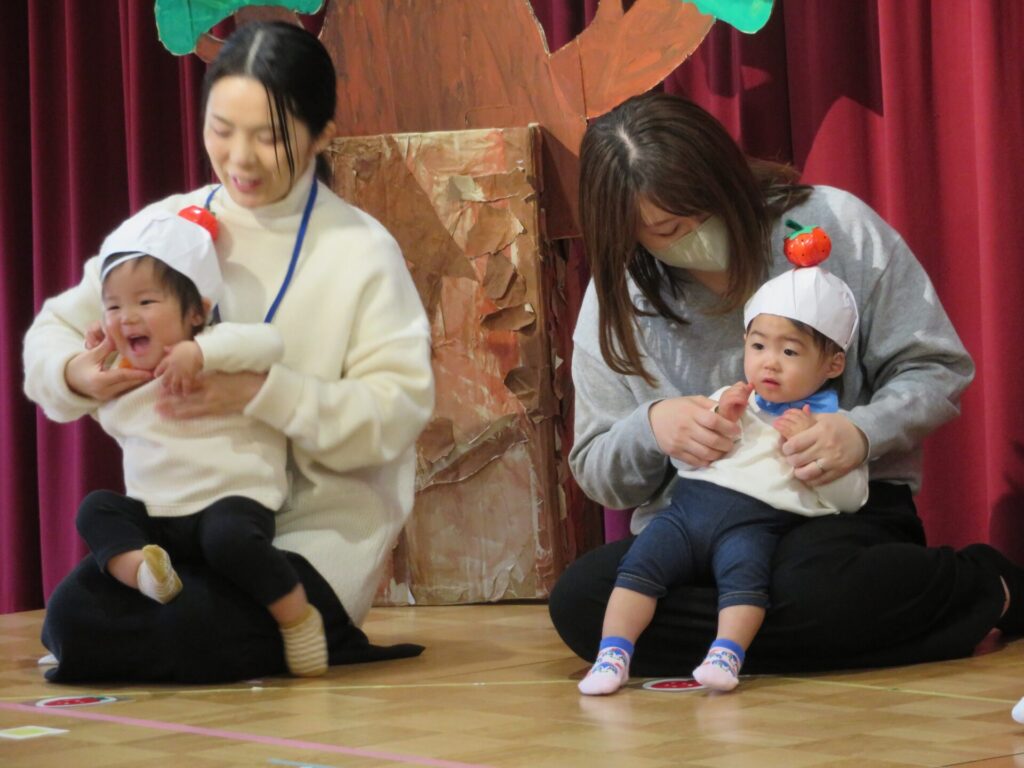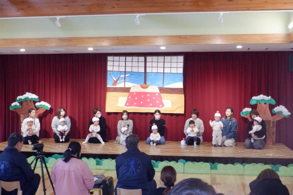 1月22日に生活発表会がありました。いちご組の子どもたちは、お母さんと一緒にわらべ歌を楽しみました🎵今年度はお正月にちなんで、お米やお餅のわらべ歌です。子どもたちは可愛いいちご大福ちゃんとみかん大福ちゃんに変身しました🍓🍊