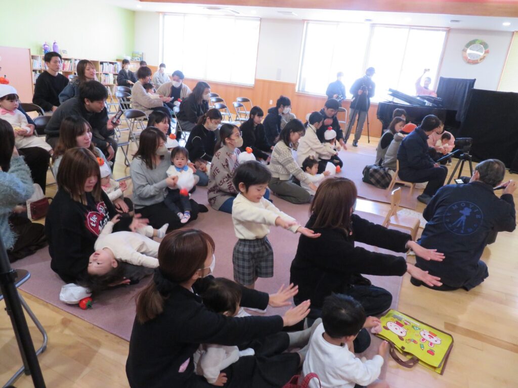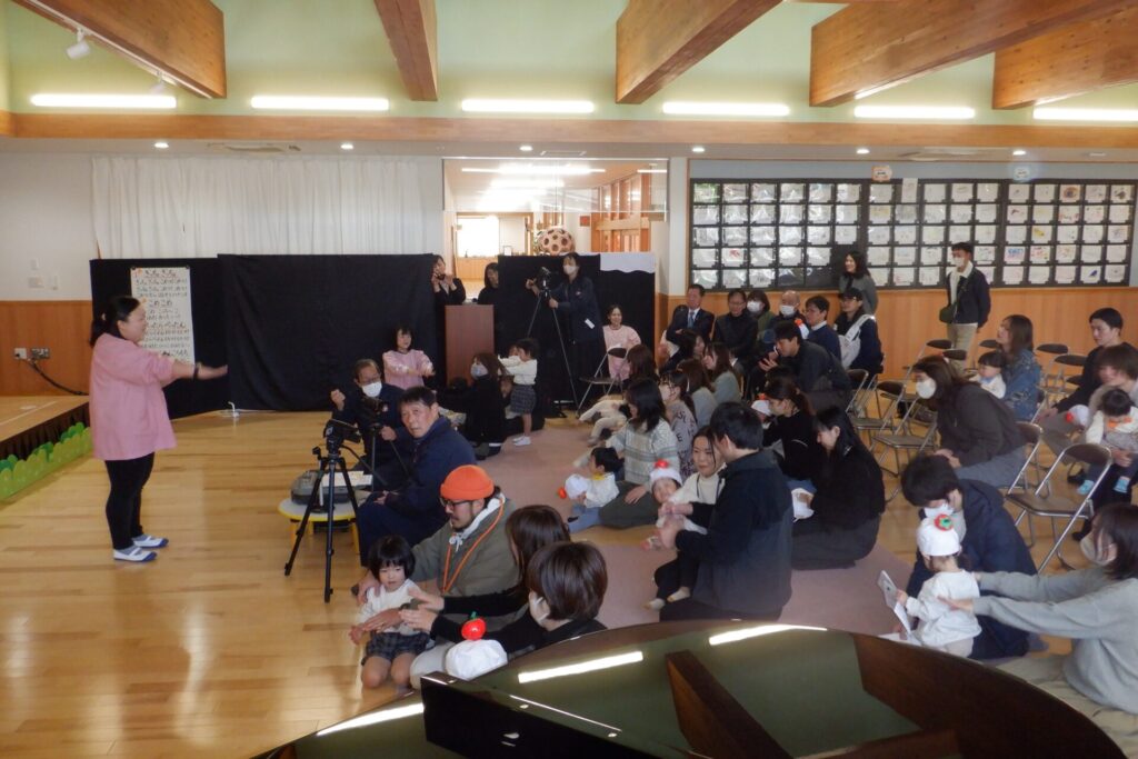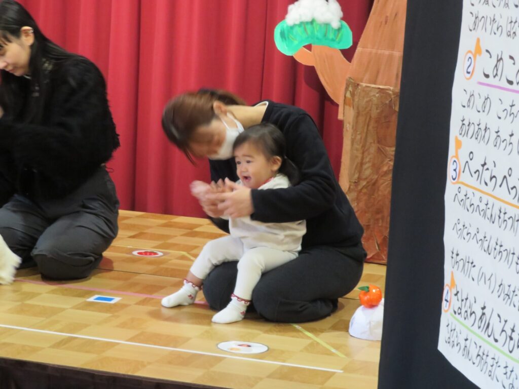 最後は、みんなで『かれっこやいて~お餅バージョン~』のわらべ歌を楽しみました🎵観客席のお兄ちゃんやお姉ちゃんも一緒に楽しんでくれました。みんなで美味しいお餅を焼くことができました💕