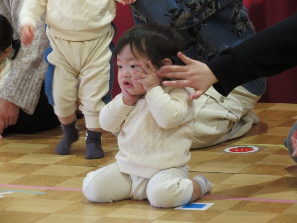 2つ目は『こめこめ』のわらべ歌です。お母さんと向き合って座り、目を合わせながらわらべ歌を楽しむことができました。お母さんたちもニコニコですね😊