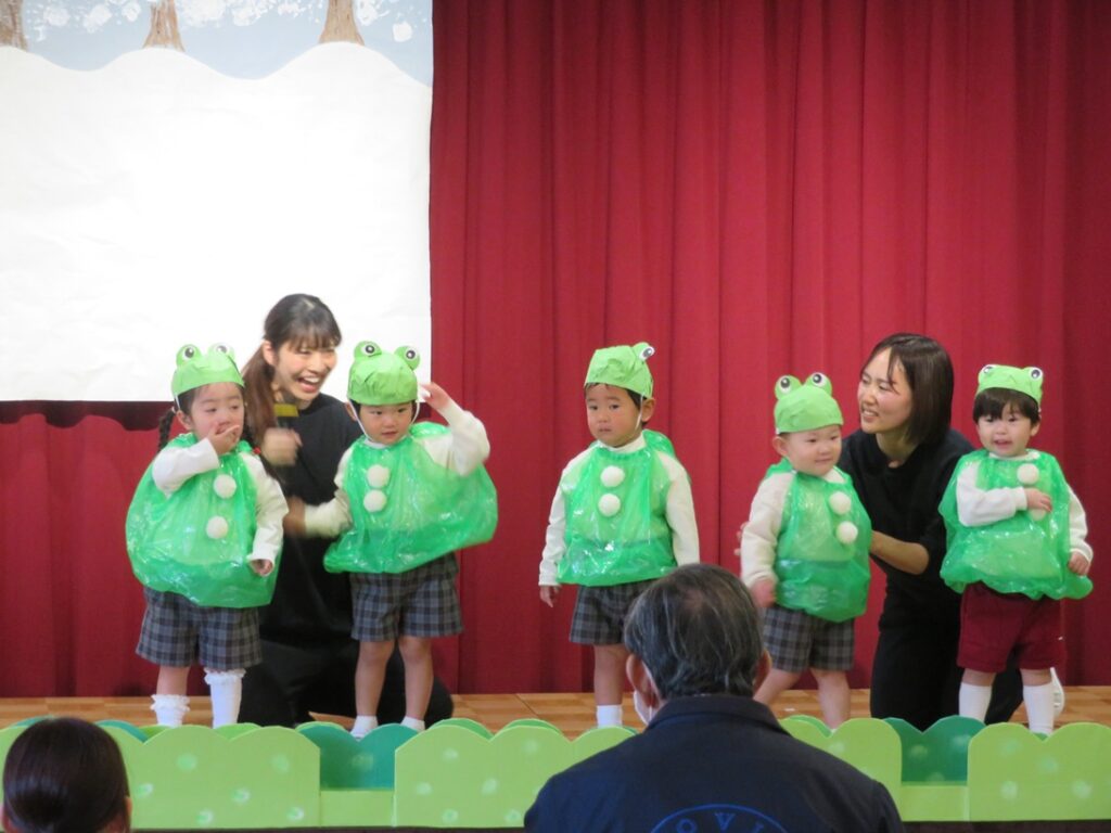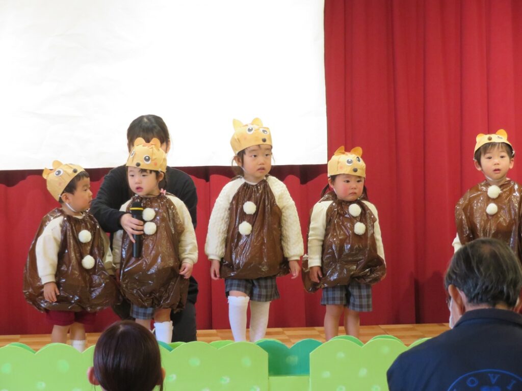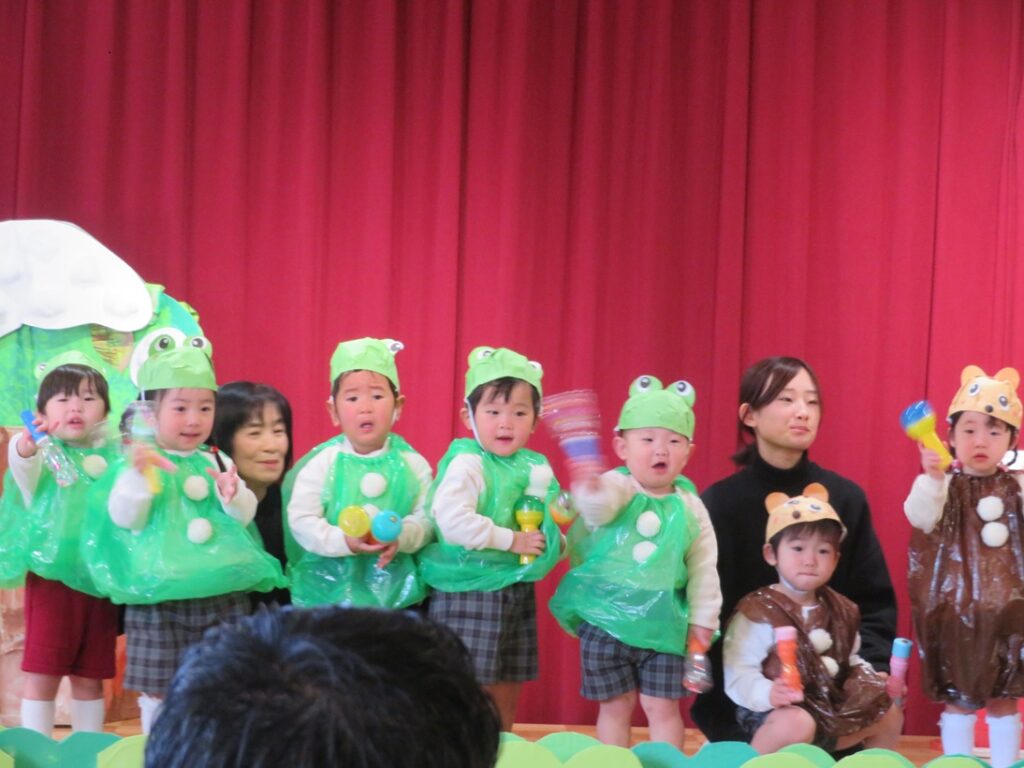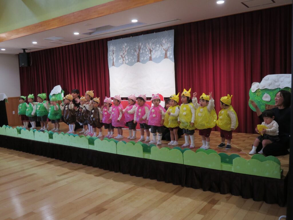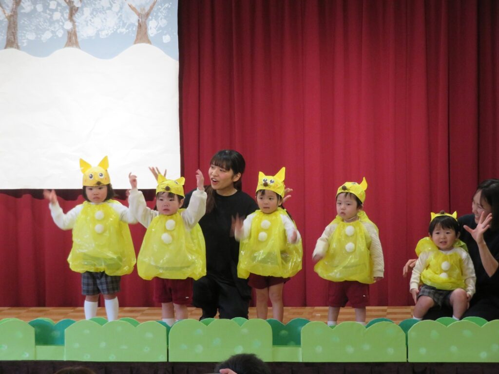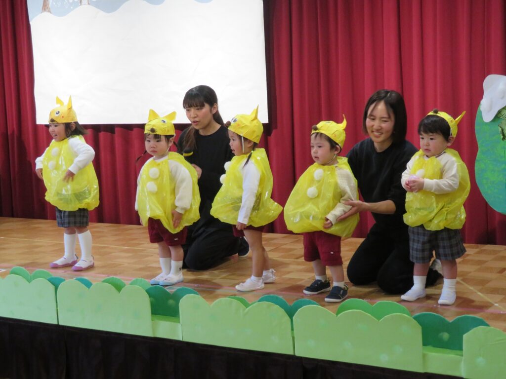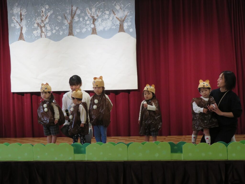 舞台に上がると、練習の時とは雰囲気も違って緊張したり、恥ずかしかったりといろいろな表情がありましたが、親元を離れて先生と一緒に舞台に出られたことに成長を感じ、また「いれて。」「いいよ。」と言った言葉も自然と出るようになったり、てぶくろの中に友達と一緒にぎゅうぎゅうに入っている姿も1歳児らしく可愛かったです💖保護者の皆様、温かい拍手をありがとうございました。