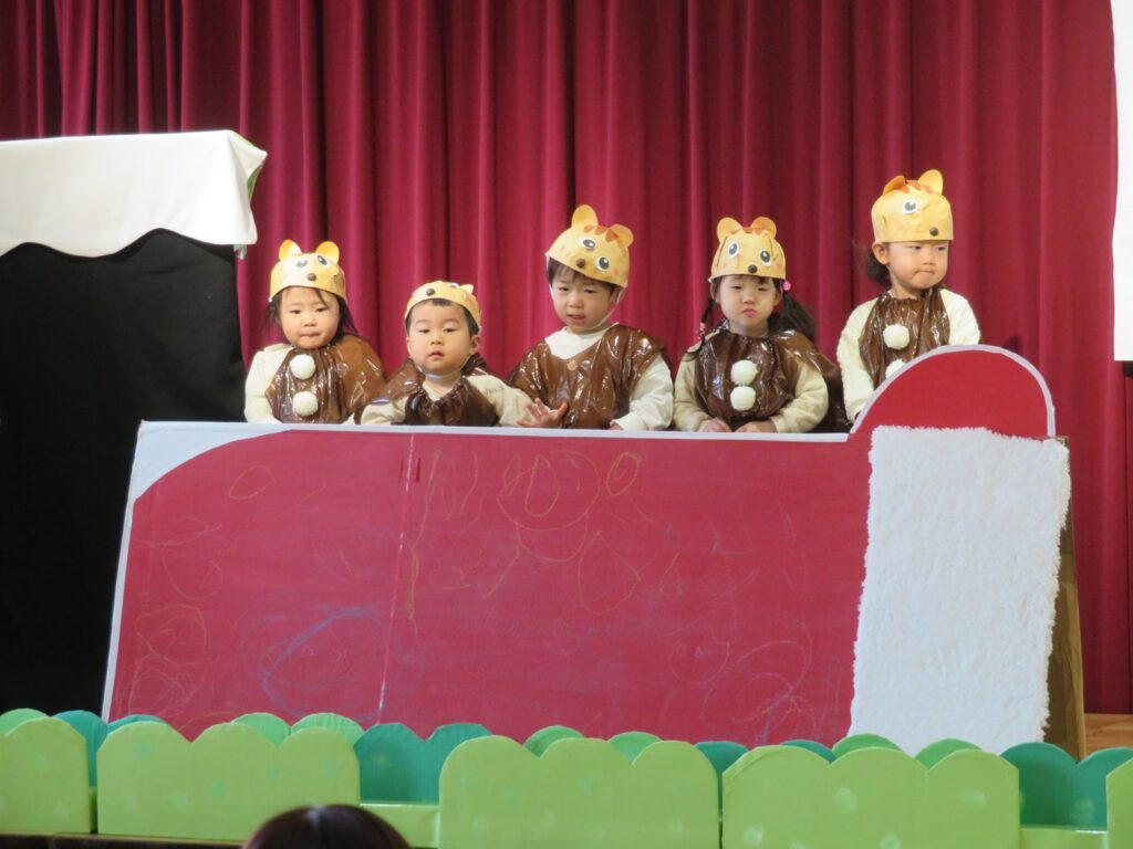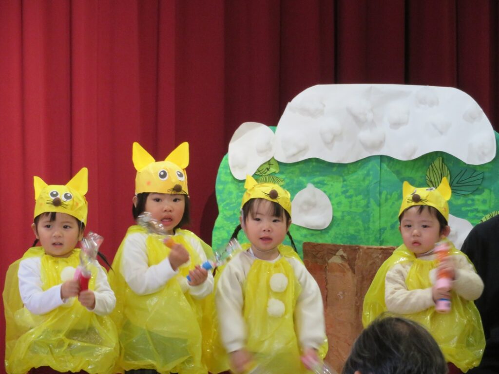 慣れ親しんできた歌を取り入れたり、友達とのやり取りでもある「いれて。」「いいよ。」などの掛け合いの言葉を入れた『てぶくろ』は、日頃の遊びの延長であるとともに、お話の世界を楽しめるものになりました。お父さんお母さんが見てくれていることを喜びに変えて、にこにこで舞台に立つことができていました。😊