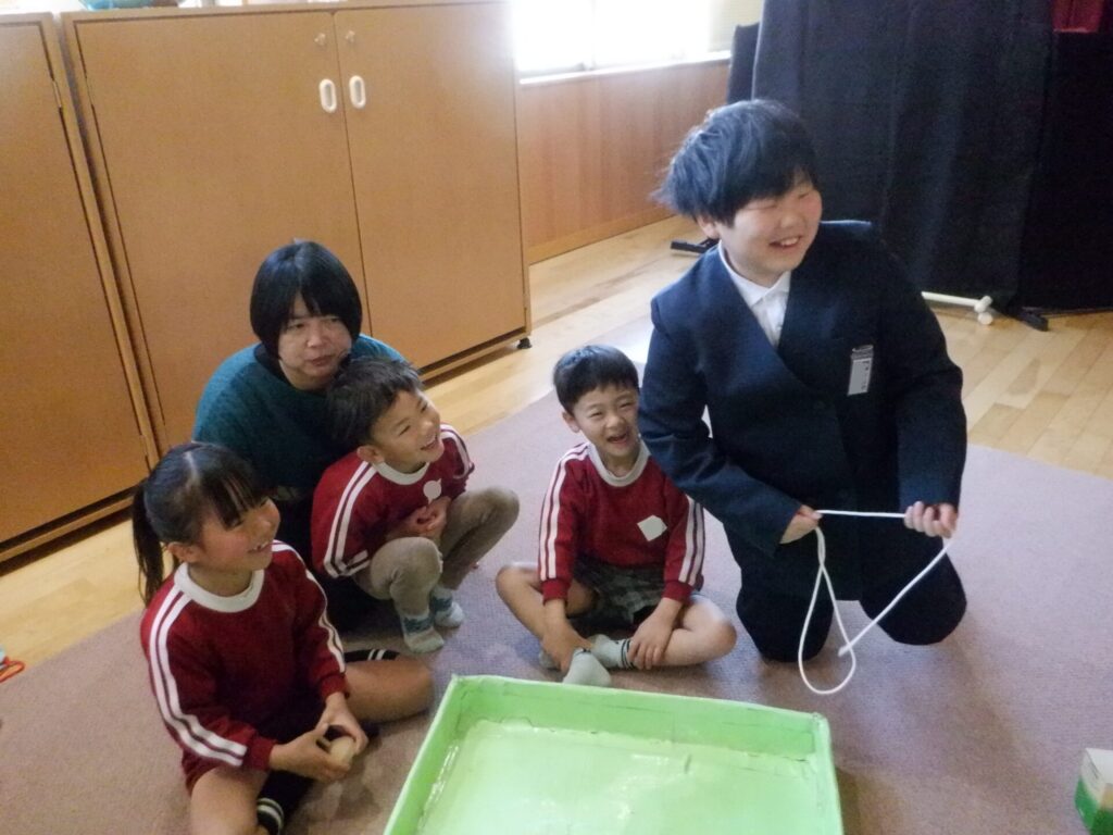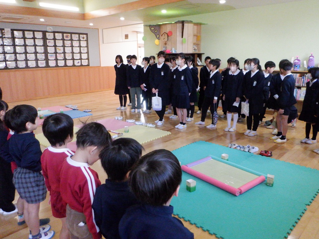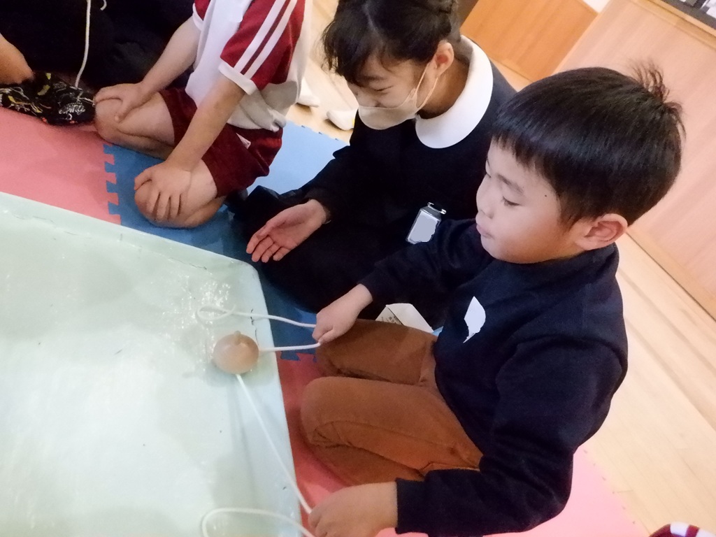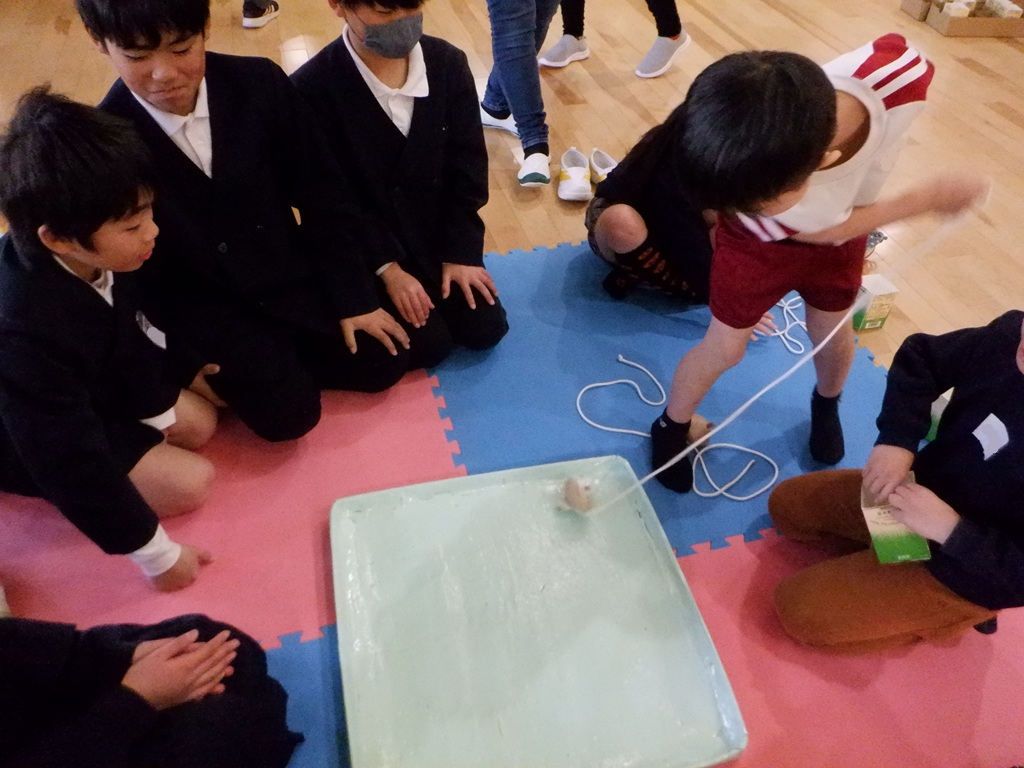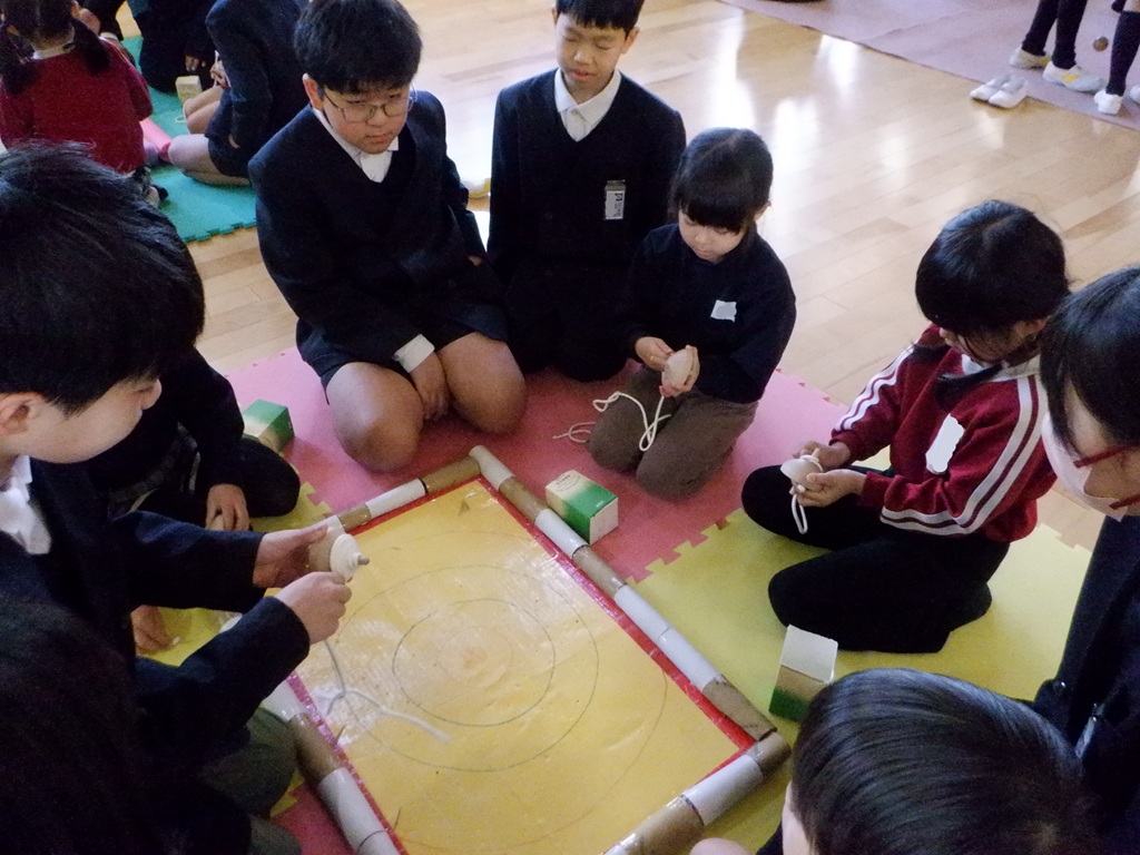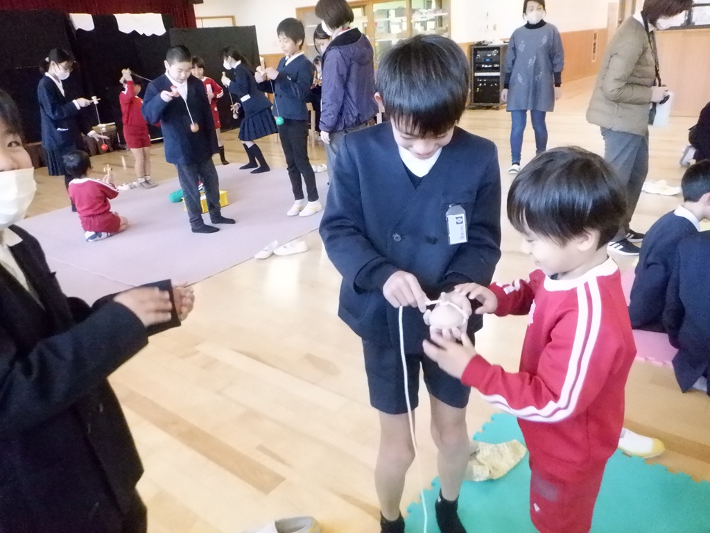 コマ回しをしたグループは、紐の巻き方やコマの投げ方を教えてもらいました。力加減が難しい紐の巻き方ですが、5年生が優しく何度も教えてくれるので、少しずつ上手にできるようになってきました。お正月に家で沢山練習してコマが回せるようになっためろん組のお友達もいます。コマを回すたびに5年生に褒めてもらって嬉しそうでした。