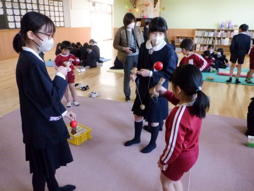 久しぶりにコマで遊ぶ5年生も楽しそうでした。幼い頃を思い出し、保育園・幼稚園時代を懐かしむ声も聞こえてきました。回ったコマに紐を掛けて移動させて遊ぶ『さんぽ♫』の仕方や、紐を使って空中に投げ上げ、手の上に乗せる『技✨』も教えてもらいました。