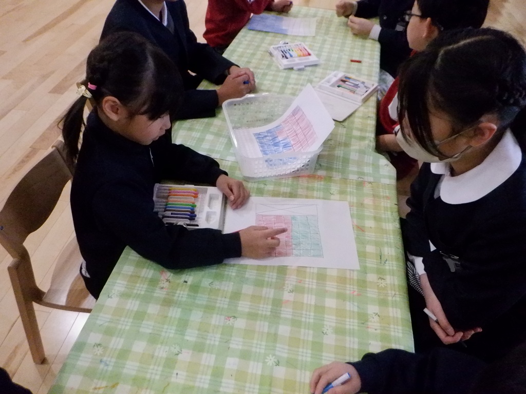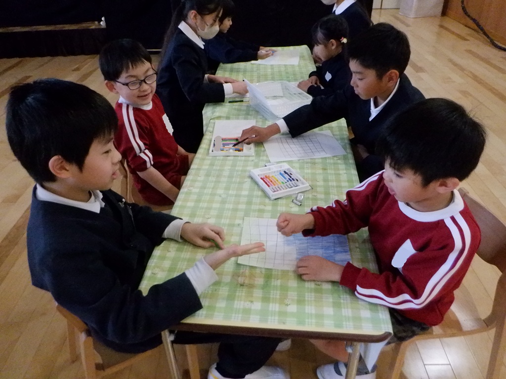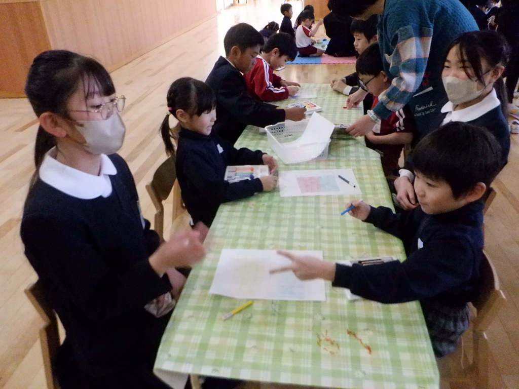 陣取りゲームもしました。ジャンケンで勝った人が1マス塗っていき、全部塗り終えた時点で沢山塗っていた方が勝ちです。「ジャンケンポン!あいこでしょ!!」一生懸命なめろん組の子どもたちは、ジャンケンの掛け声や出す手にも力が入ります。塗り終えたマスを5年生と一緒に数えてもらいました。とても楽しかったようで「もう一回やろう❤」と、すぐに2回戦が始まっていました。