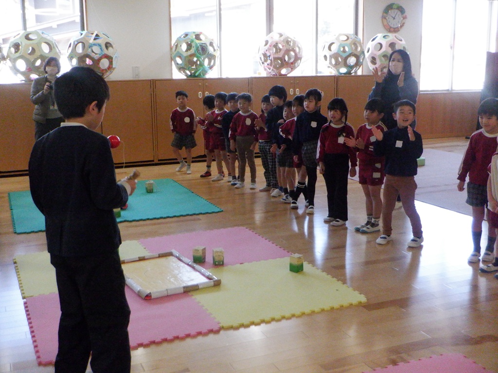 けん玉も楽しみました。大皿と中皿に交互に乗せるのをお姉さんに見てもらいました。「すごい!上手!!」と沢山褒めて貰えて嬉しかったですね。5年A組には、けん玉名人のお兄さんがいて交流の終わりに披露してくれました。『うさぎとかめ』の歌に合わせて玉を大皿と中皿の交互に乗せていくのですが、そのリズミカルなこと!!3曲分も軽々とやって見せてくれました。めろん組の子どもたちは歌と拍手で応援します。最後に玉をけん先にさす『とめけん』を見せてもらうと、子どもたちからは大きな歓声と拍手が起こっていました。