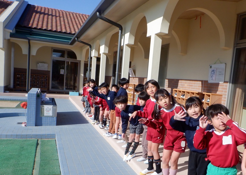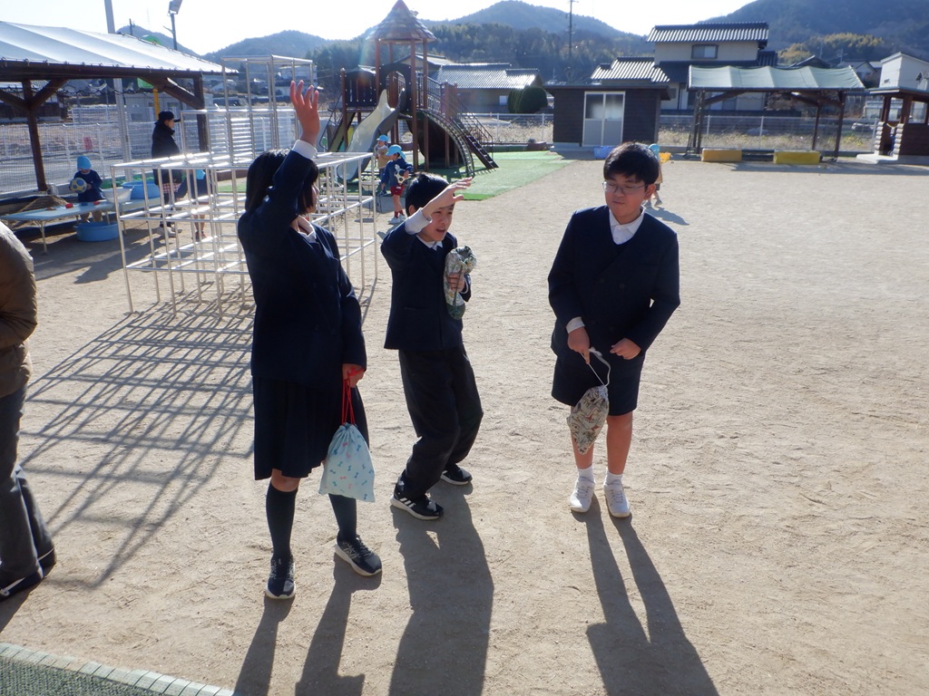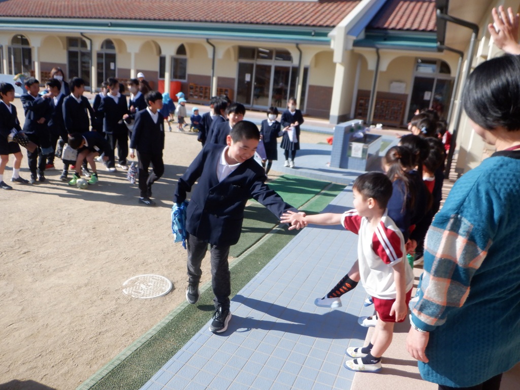「ありがとうございました。」寂しいですが終わりの時間になってしまいました。お兄さんお姉さんの姿が見えなくなるまで見送りました。「次は1日入学で会いましょう!」山手小学校での再会を約束してお別れました。2回の交流を通じてめろん組の子どもたちは5年生ととても仲良くなることができ、小学校へ入学するのがますます楽しみになりました。山手小学校の5年生の皆さん、遊びに来てくれてありがとうございました。