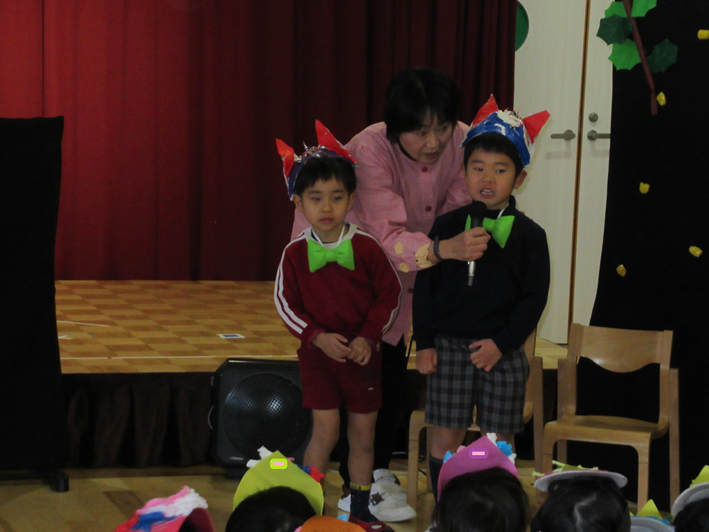 プログラム3番。『節分クイズ』です。節分にちなんだクイズをみんなで楽しみました。「節分のときに食べる長いものはなーんだ?」「正解は・・・恵方巻でーす!」今年は南南東を向いて食べることも教えてもらいました。
