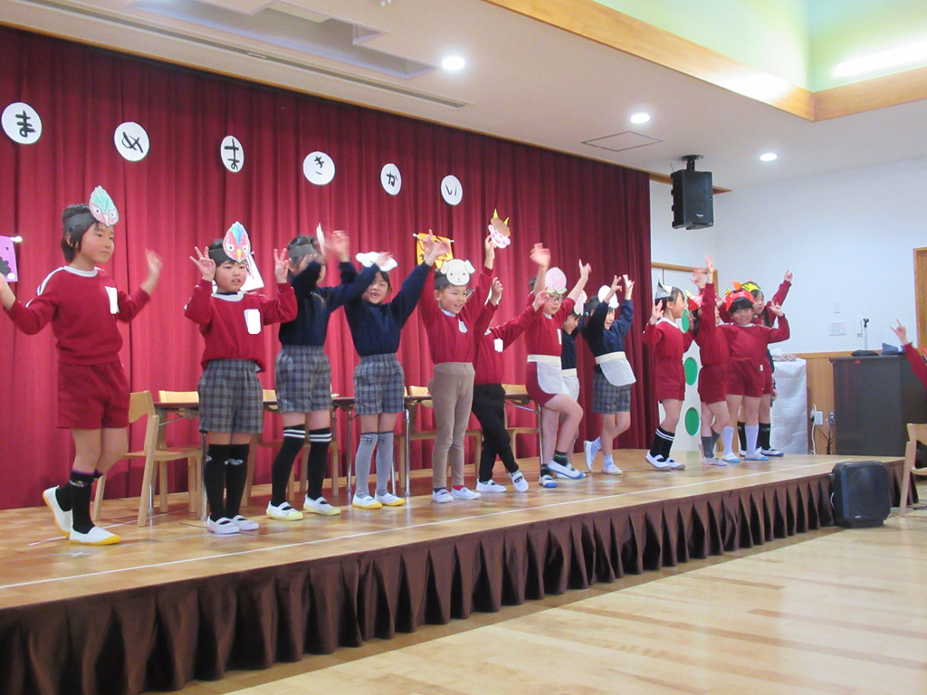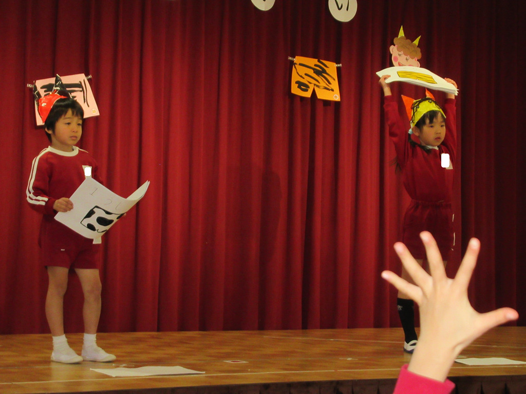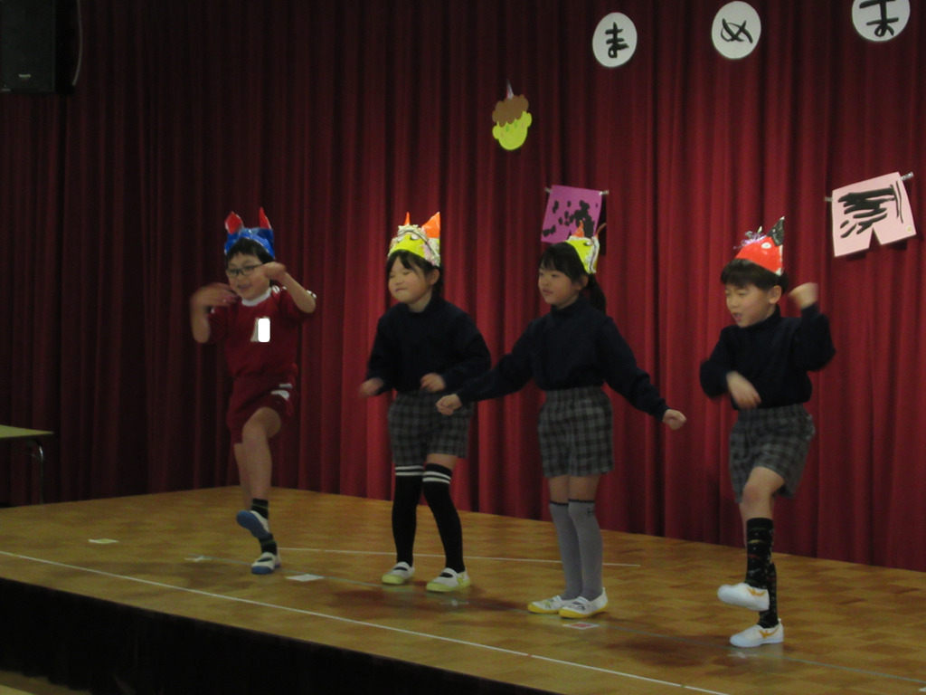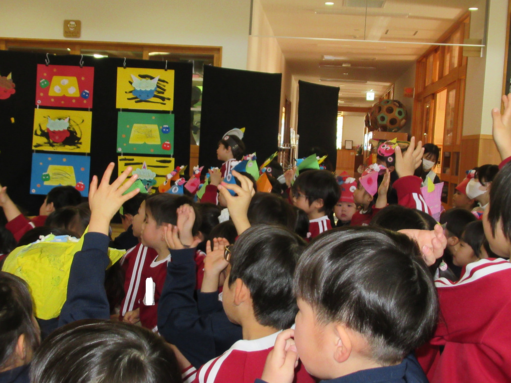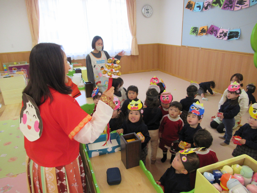 ばなな組、ぶどう組、みかん組、めろん組の子どもたちの所にも福の神がやって来ました。「鬼は外、福は内」の掛け声で豆をまき、最後には福の神と一緒に笑い、福を呼び込みました🎵