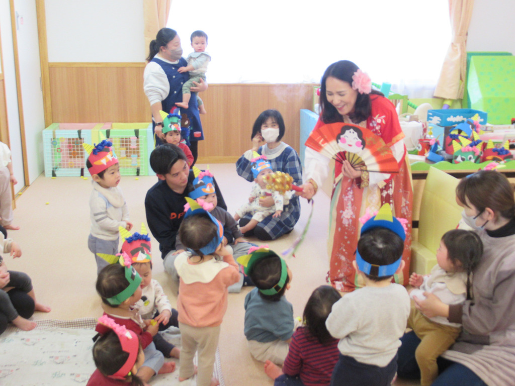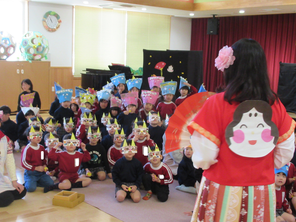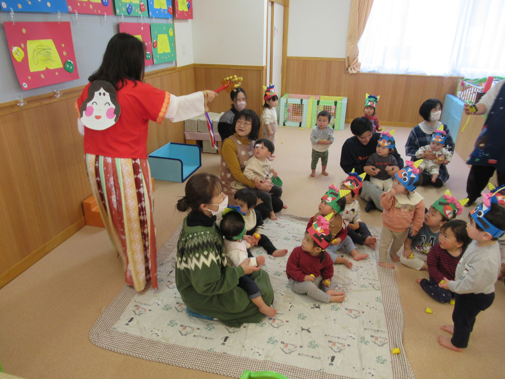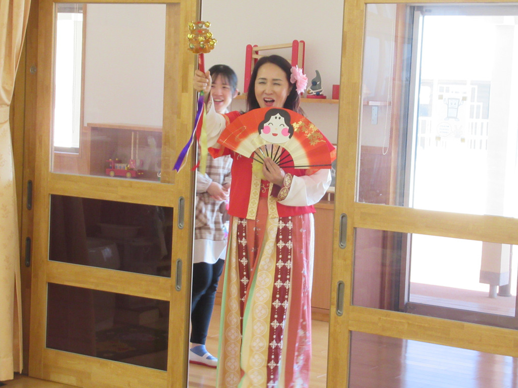 いちご組、もも組のお部屋に福の神が来ました。みんなで笑い声を響かせて、福を招きました。「ほっほっほっほ~😊」