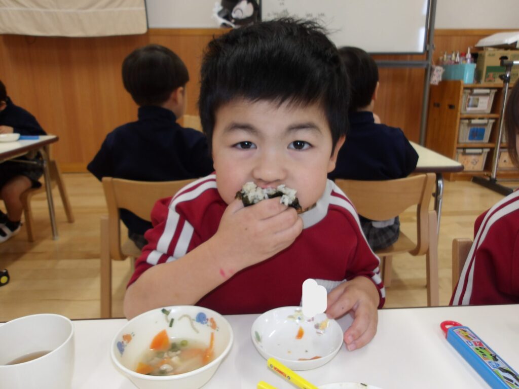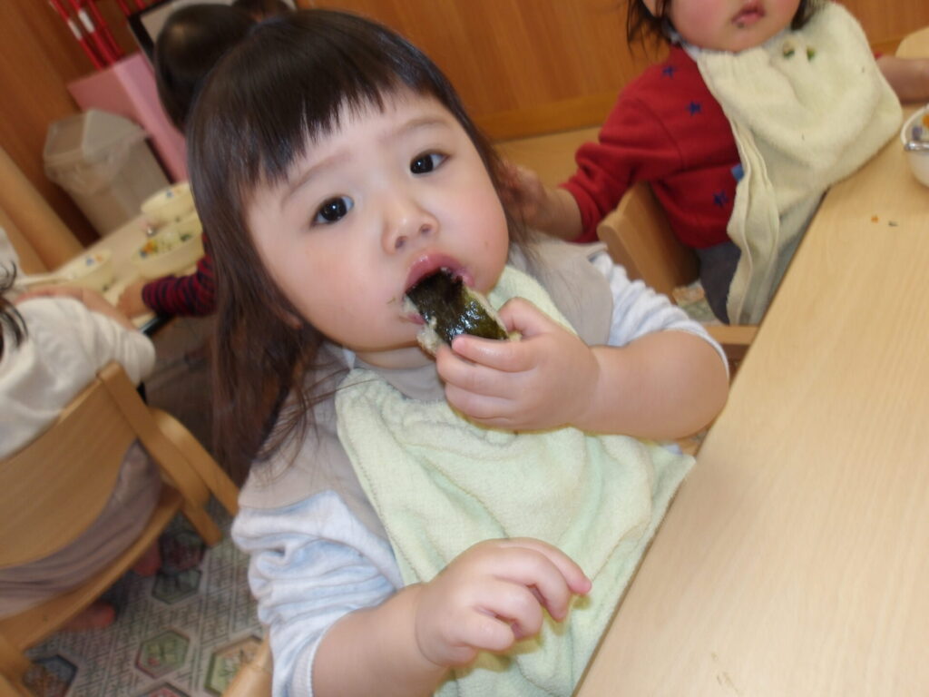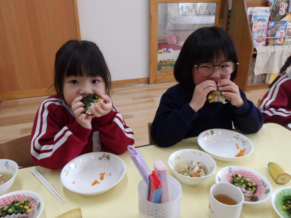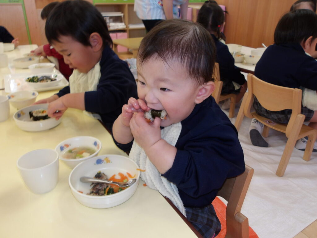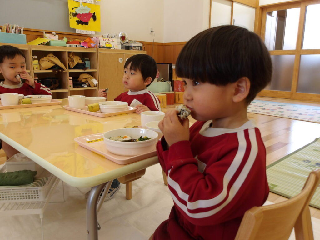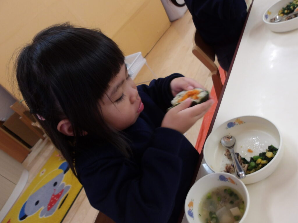 めろん組とみかん組は、自分たちで巻いた恵方巻を上手に巻くことができた喜びもあり、おいしそうに食べていました✨