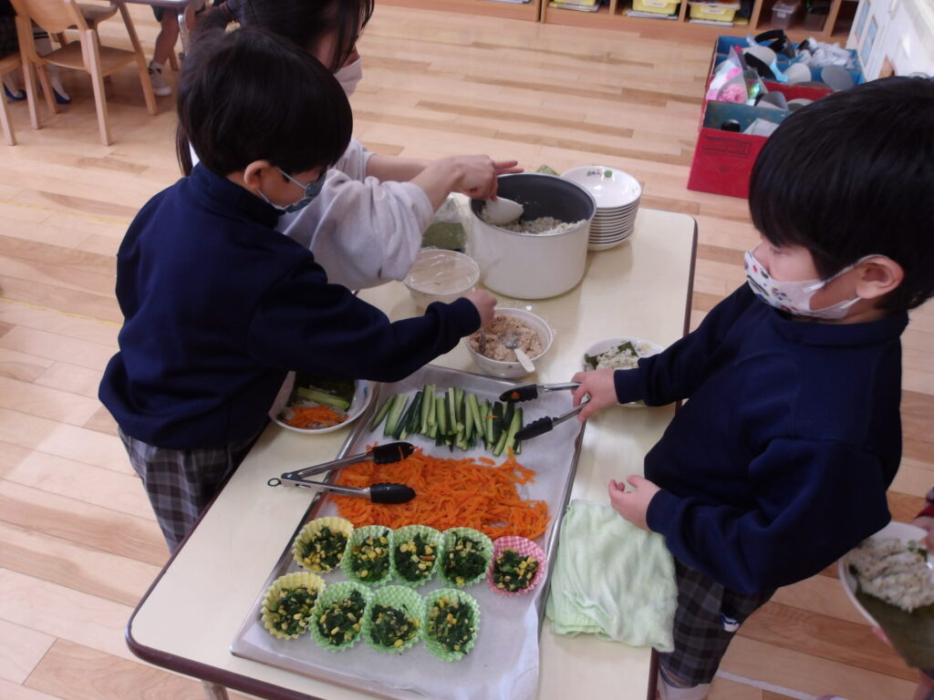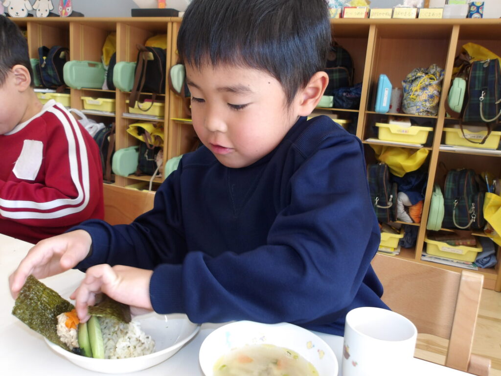 めろん組とみかん組は、恵方巻を自分たちで巻き、バイキングもしました⭐