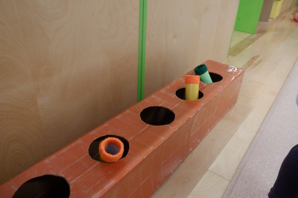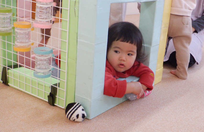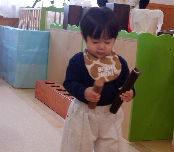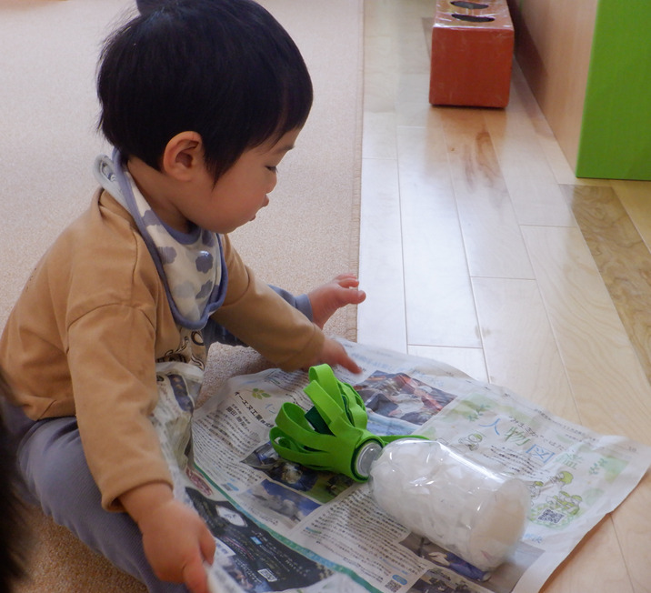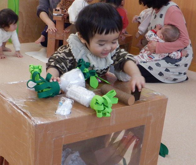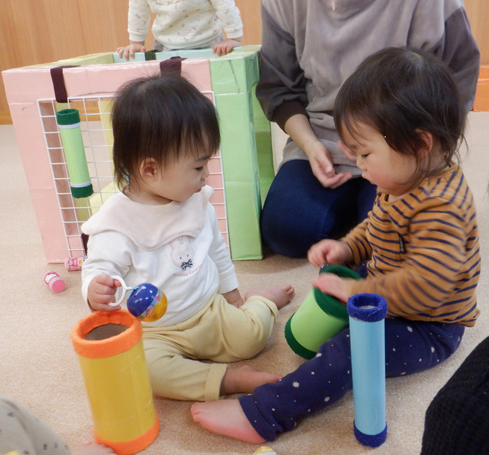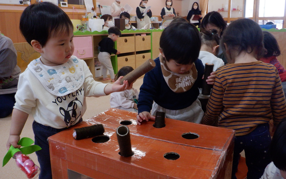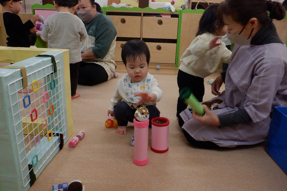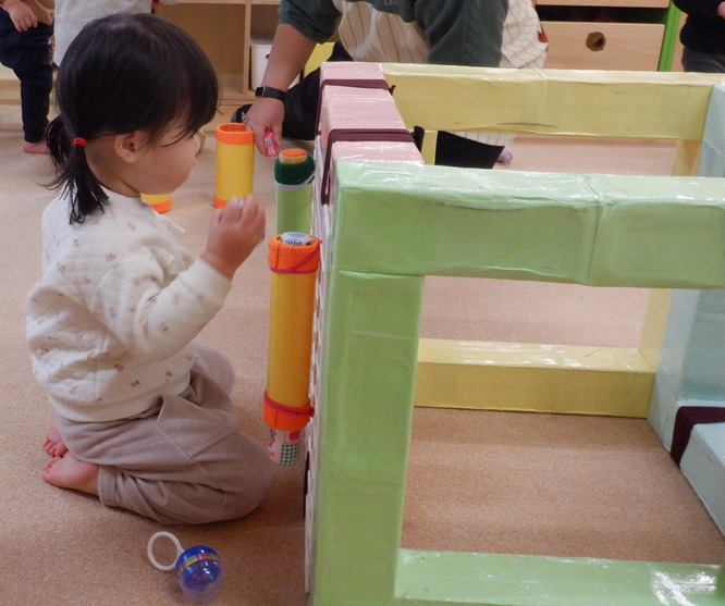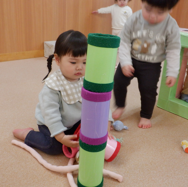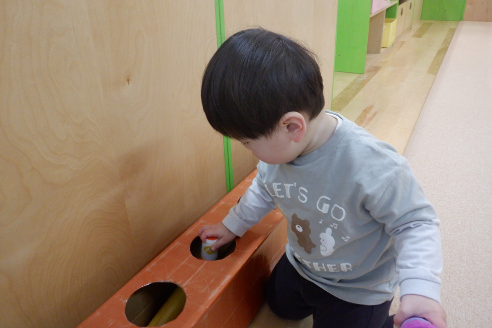 登園してきた子どもから、今日は指先を使った遊びをしました!!ペットボトルの蓋を筒の中に入れたり、布の紐をワイヤーネットの穴に入れたり出したりを繰り返し楽しみました。子どもたちは、どこに何が置いてあるのかも分かっているので、自分で音の鳴る玩具や動物ボールなどを出してきて楽しんでいます。