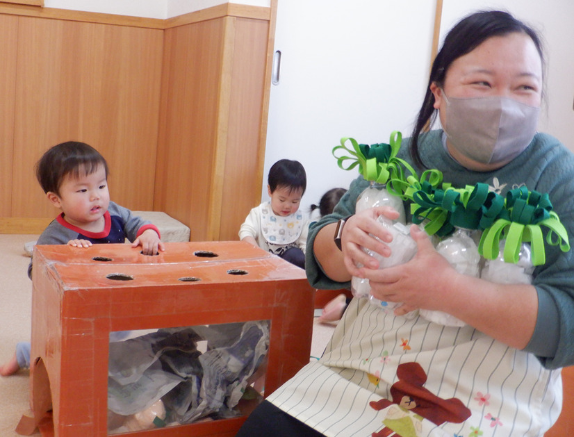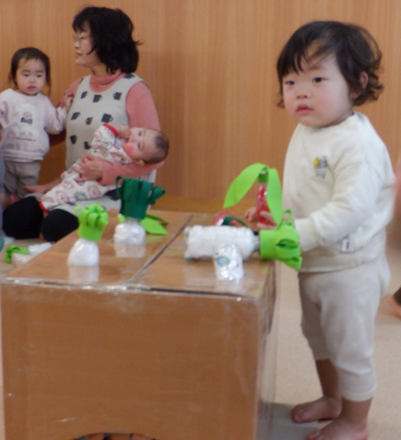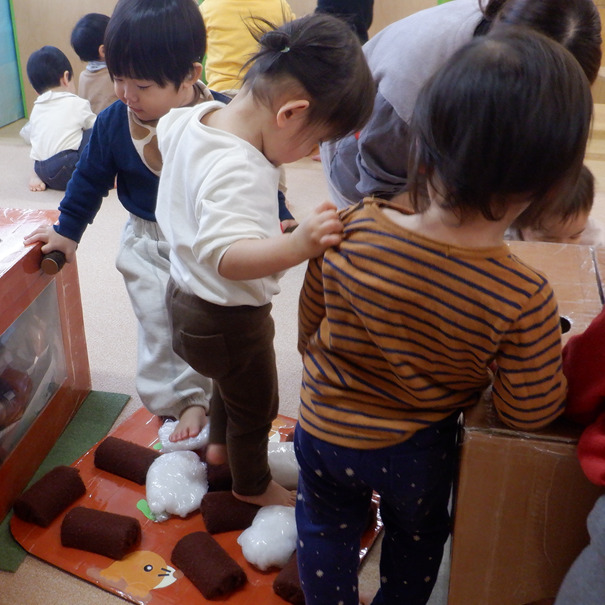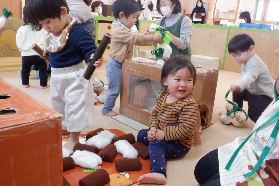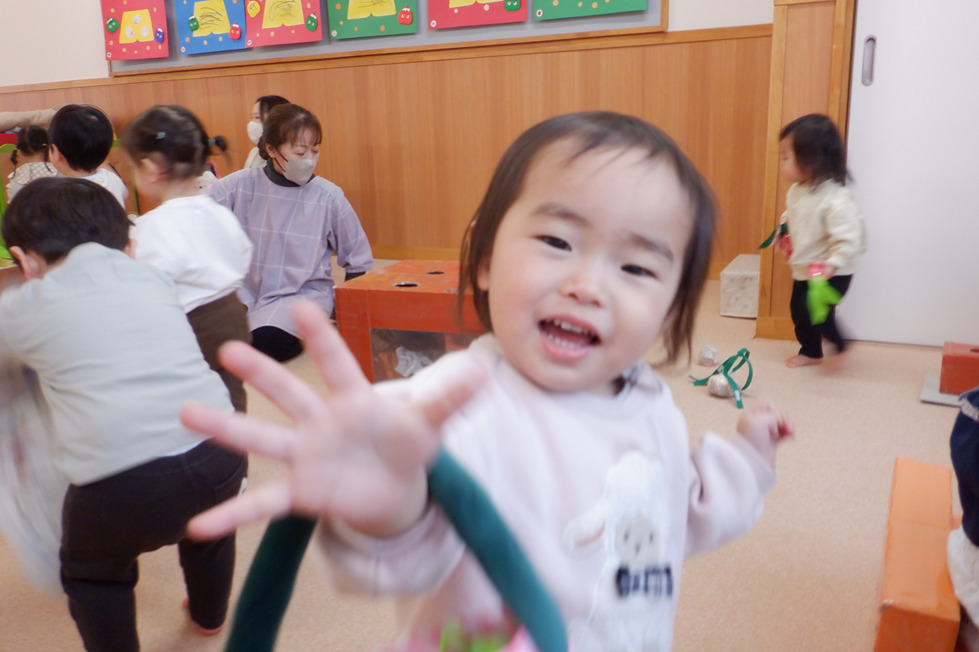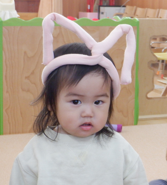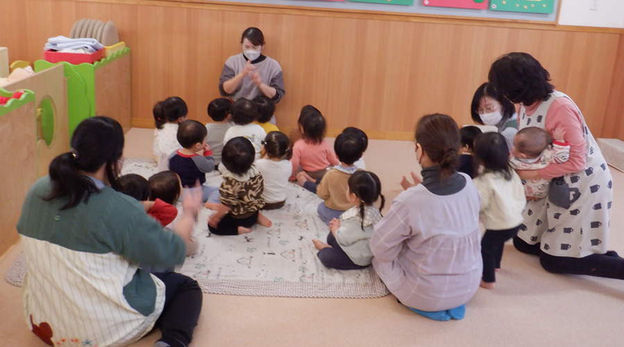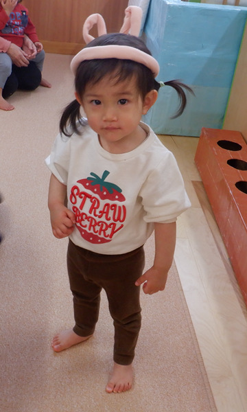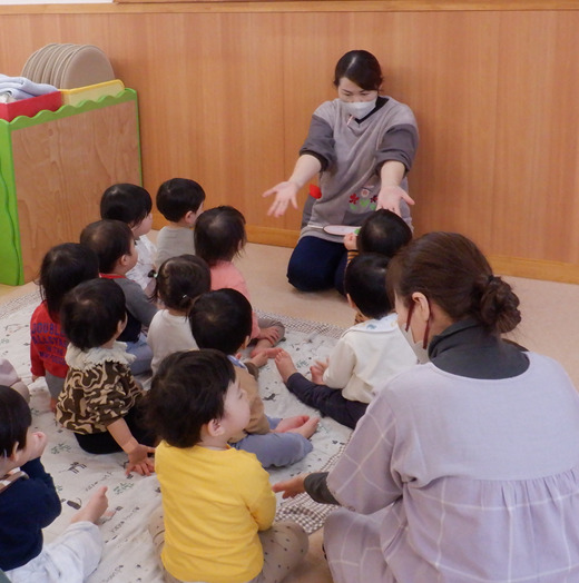 おやつを食べて、お腹も満たされた子どもたちは、先生の声かけを聞いて上手に集まると、「だいこんつけ」🎵のわらべうたを、先生の歌声に合わせて上手に自分の両手を裏返したり、表返しをして楽しみます。言葉のまねっこも楽しむようになり大好きなペープサート「おやさいをたべよう」が始まると何のお野菜がでてくるのかワクワクした表情をのぞかせ、「だいこん」「コンコン」と頭をコンコンとした仕草を見せたり、「じゃがいも」「も~」「じゃがも」「も~」と言葉の掛け合いをしています。成長に合わせてできるようになった仕草や言葉のまねっこが可愛く、子どもの成長を感じ、いちご組はいつも笑い声に包まれています。