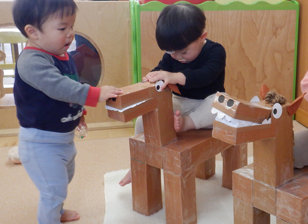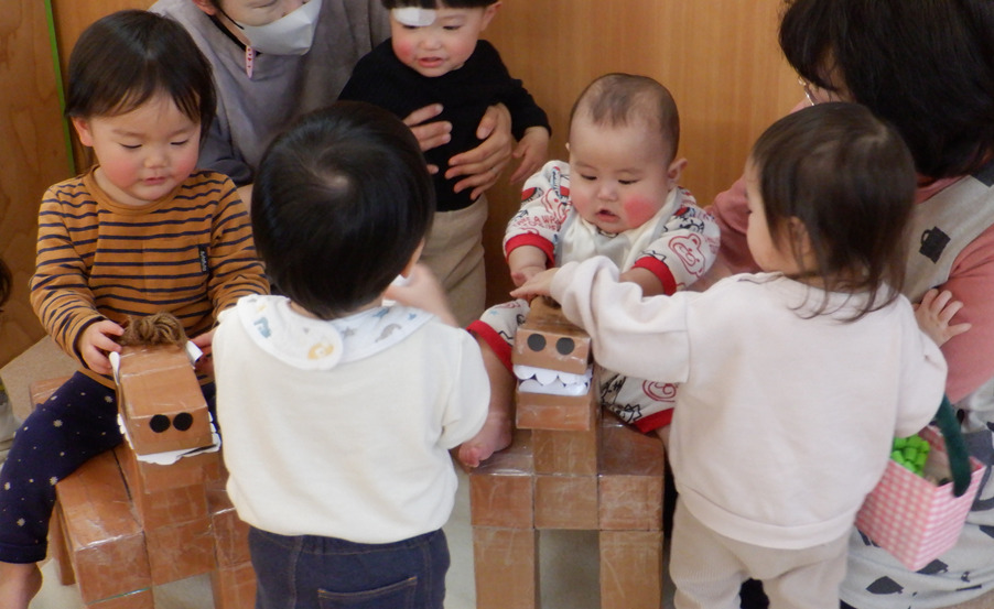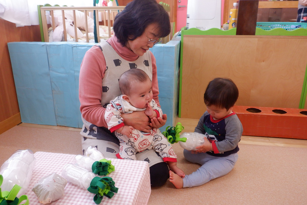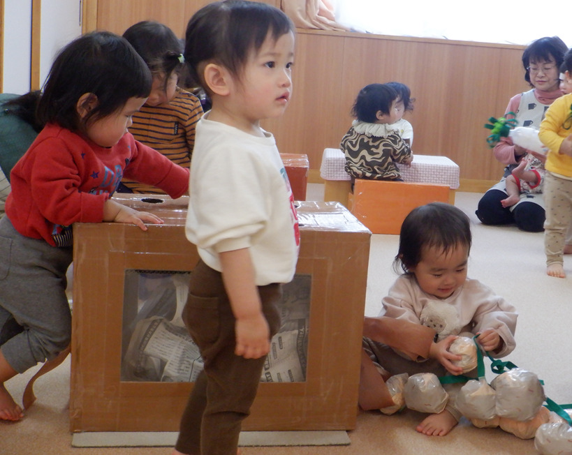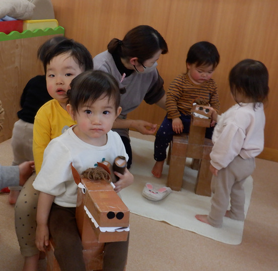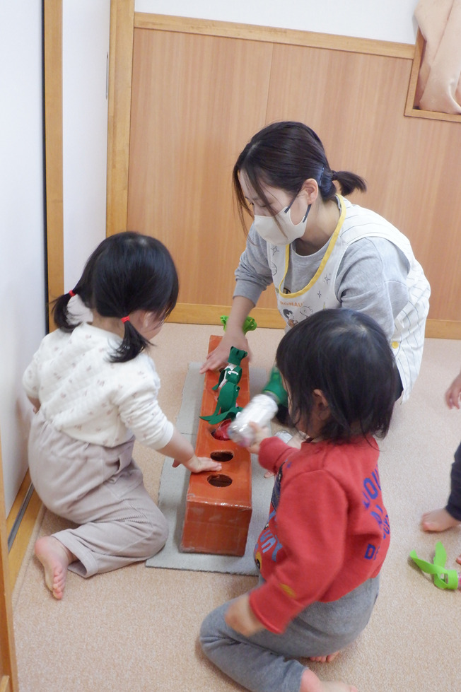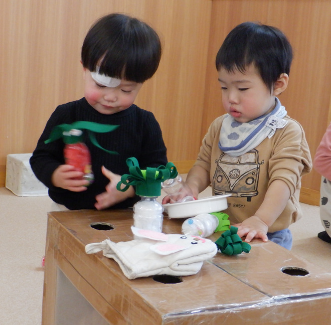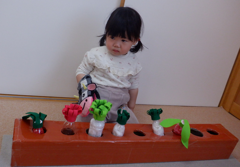 いちご組さんは夏には夏野菜の収穫、秋には芋掘り、正月明けにはおもちつきと季節が感じられる遊びをたくさん楽しんできました。今日は冬のお野菜の収穫遊びを楽しむ中で、子どもたちは収穫した野菜を食べたり、大好きな動物にも食べさせてあげたり、先生と「どうぞ。」「ありがとう。」とやりとりを楽しんだり、先生が仲立ちとなり友達の存在を意識しながら遊ぶなど、1つ1つの遊びにつながりが見られるようになってきました。子どもたちは言葉を発して自分の思いを先生に伝えたり、先生や友達との関わりに興味を持っています。こらからも子どもたちの思いに共感し、会話を楽しみながら興味を持っているお野菜を使ってままごと遊びも楽しんでいきたいと思います。💕