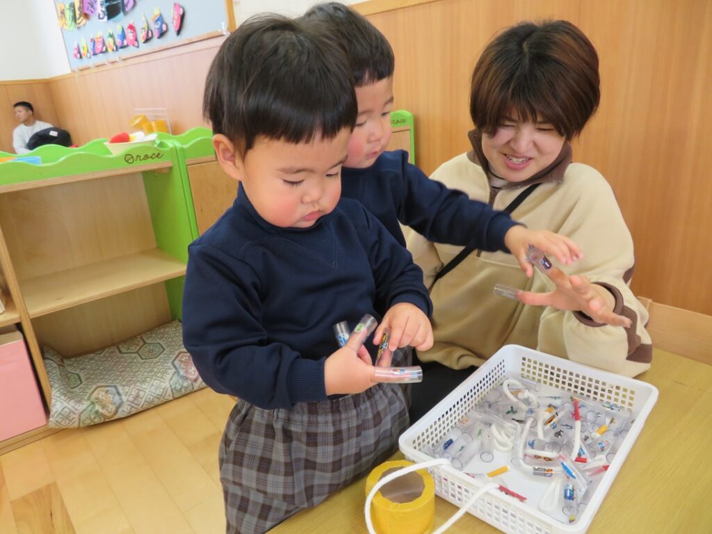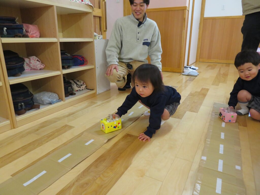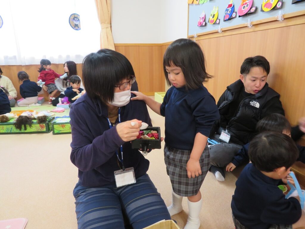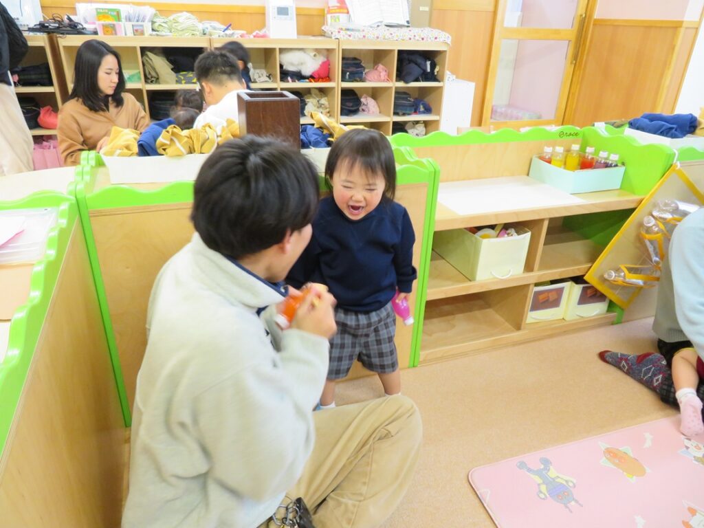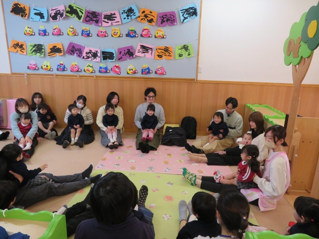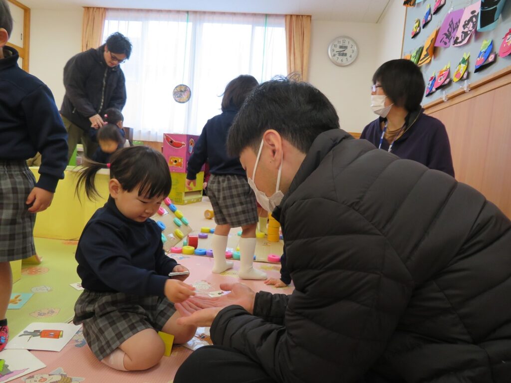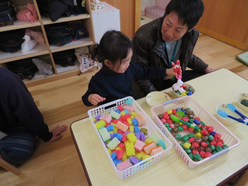 今日はお忙しい中、参観してくださりありがとうございました。いつもと違う雰囲気に戸惑う姿もありますが、お父さんやお母さんが一緒にいることで安心して過ごすことができたもも組の子どもたちです。お父さんやお母さんと一緒に様々な遊びを見つけて遊ぶことができましたね。もも組で過ごすのも残り2カ月となりましたが、笑顔いっぱいで友達や先生と一緒に過ごしていこうと思います。