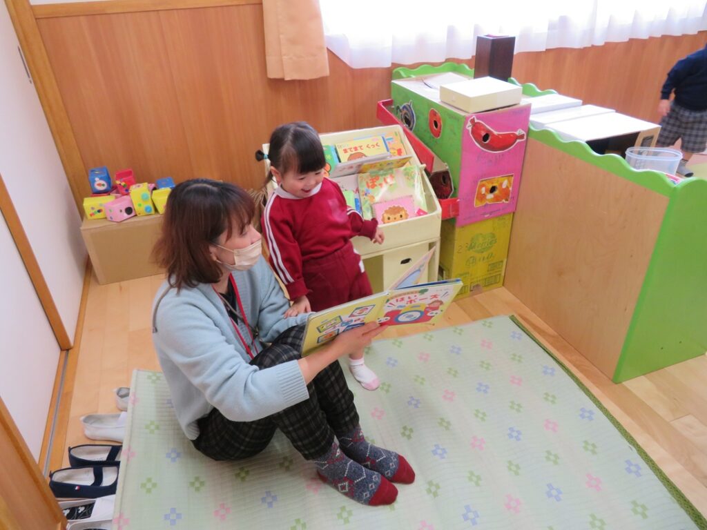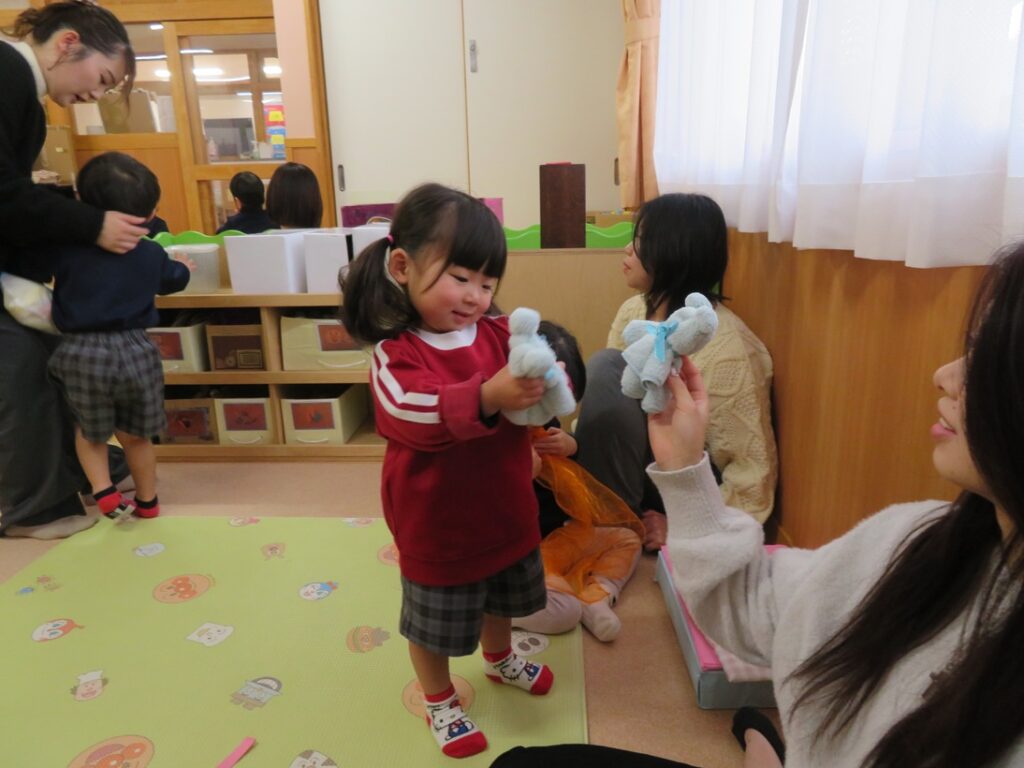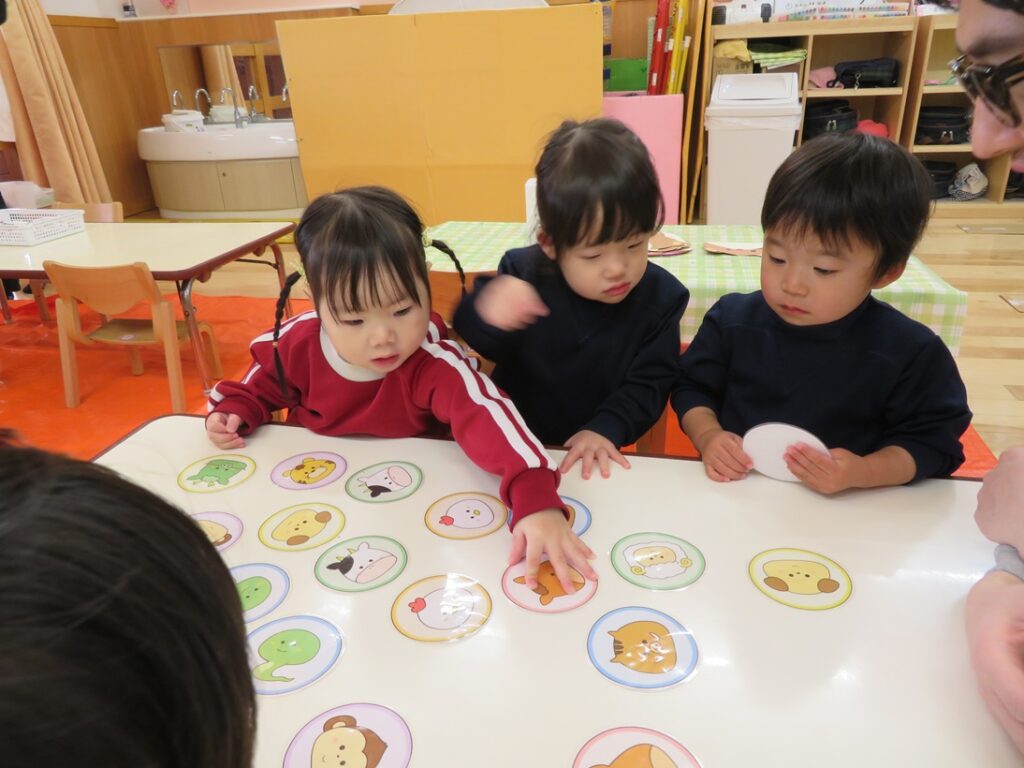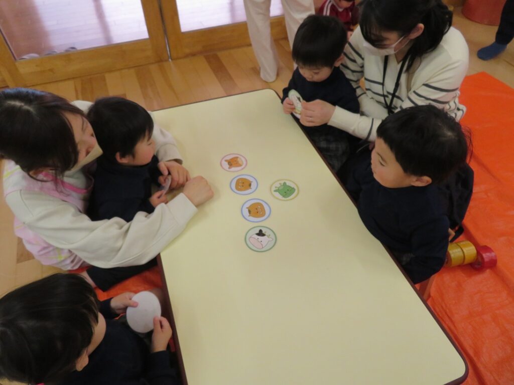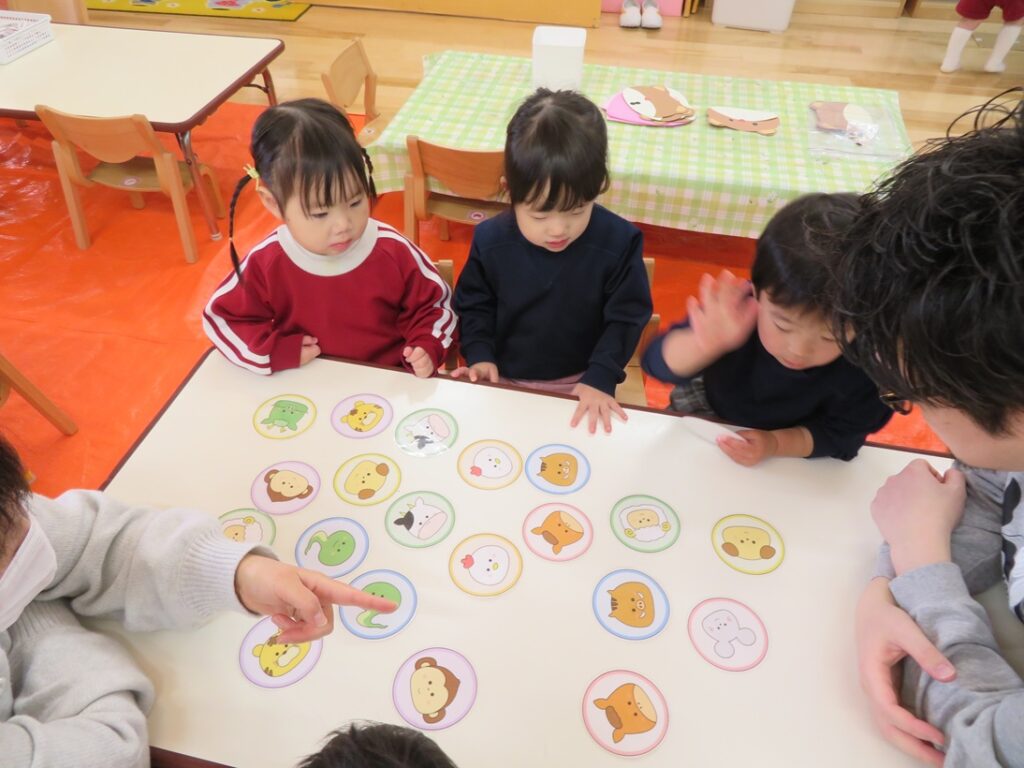 正月遊びの時に、みんなで楽しんだカルタを用意すると、楽しそうな声に周りの子どもたちも集まってきて、友達やお母さんと一緒に絵カルタ遊びが始まりました😝「動物の名前を言ったら取るんだよ。」と話しをすると、お母さんや先生の話をよく聞いて言われた動物のカードを取ることができました。一生懸命に手を伸ばしている姿がかわいらしいです。