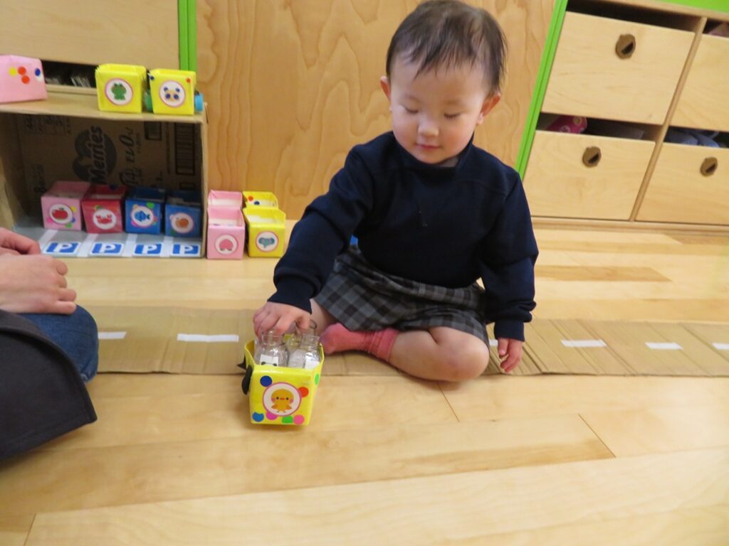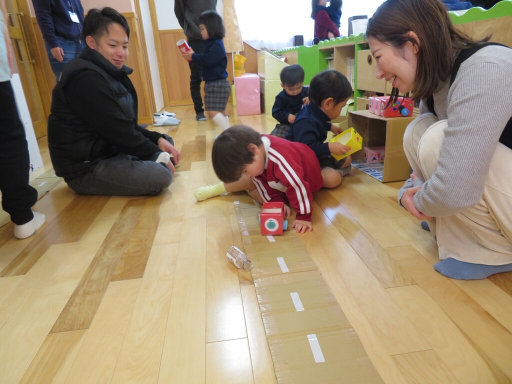朝からにぎやかな声が部屋に響き渡り、子どもたちも元気に登園してきました。お母さんやお父さんと一緒に遊ぶことを知ると、「こっち行こ。」「これする。」と子どもたちから声が出て、傍に居てくれることに安心したようで朝の遊びでは、一人一人が行ったり来たりしながら自分の好きな遊びを楽しむことができていました。朝の遊びでは、自分で作った車を使って道を走らせたり、動物を乗せたりして遊びました。