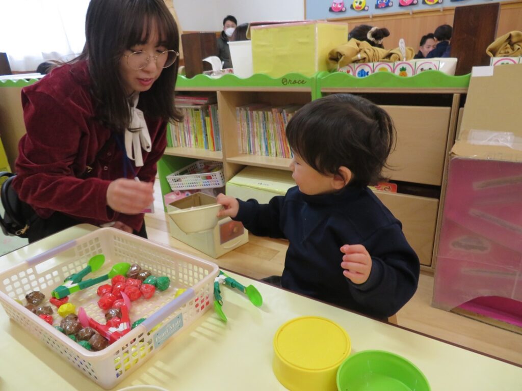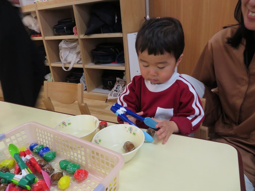 手を上手に動かしてトングを使っています。スポンジや小さいボールなどいろいろなものをつかむことができていました。つかみにくい時には、持ち替えてどうやったらうまく持てるのか考えて遊んでいます。