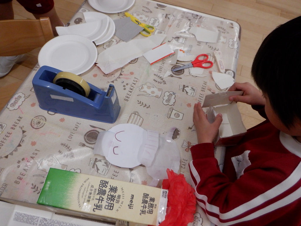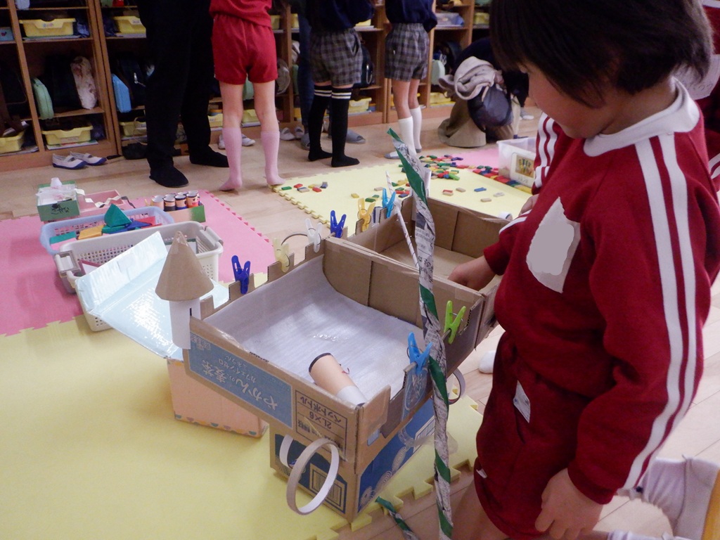 登園後は自分の好きな遊びをして過ごしました。工作、人形遊び、オセロ、トランプ、けん玉、あやとり、こま回しと、お家の人と一緒に楽しみ沢山の笑顔が見られました。