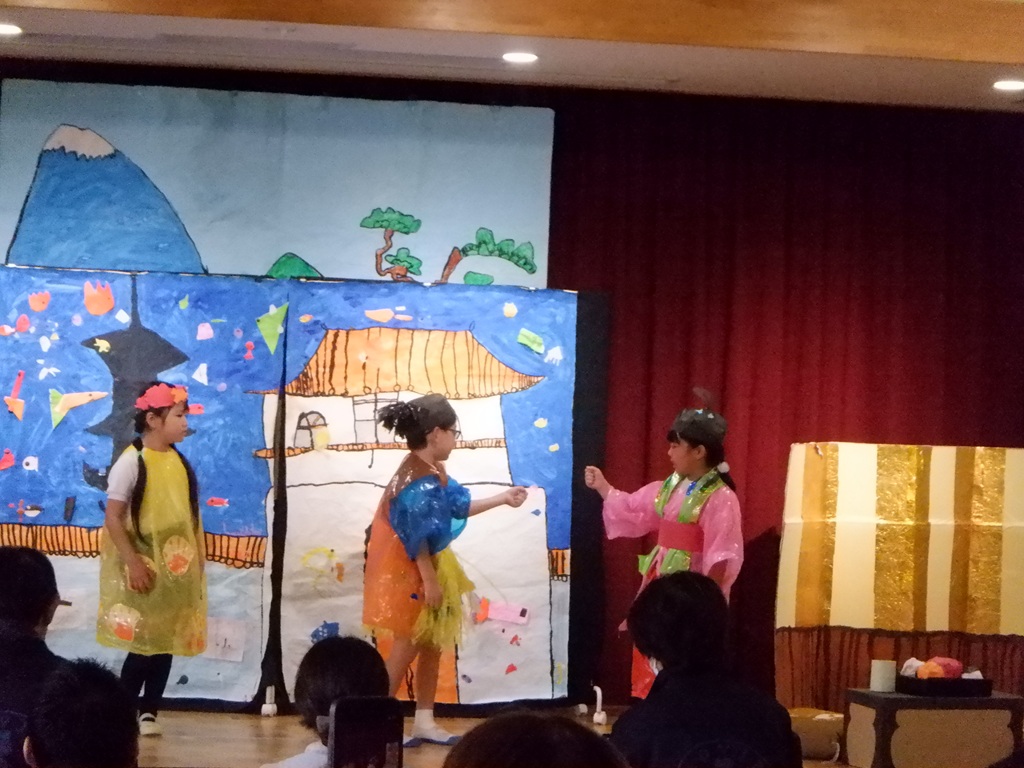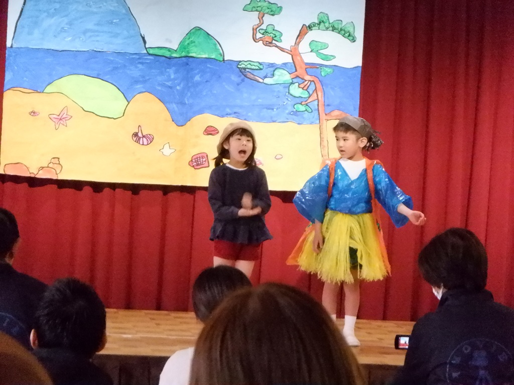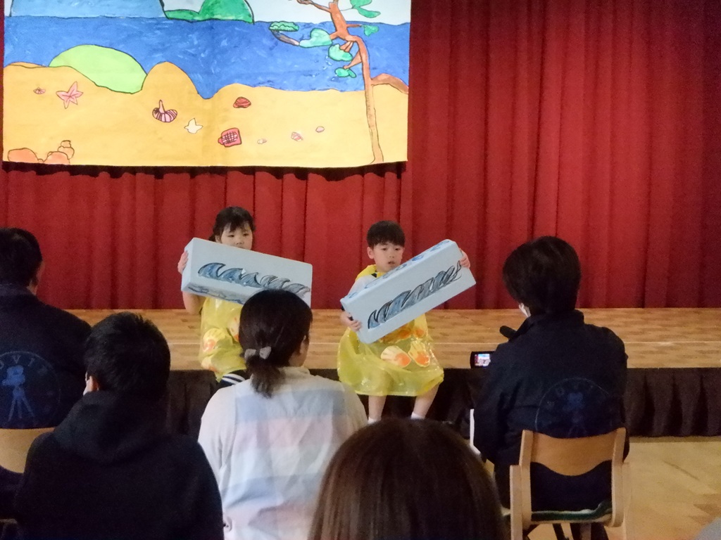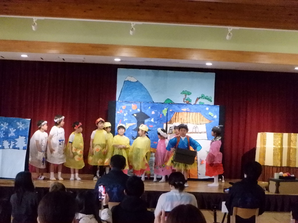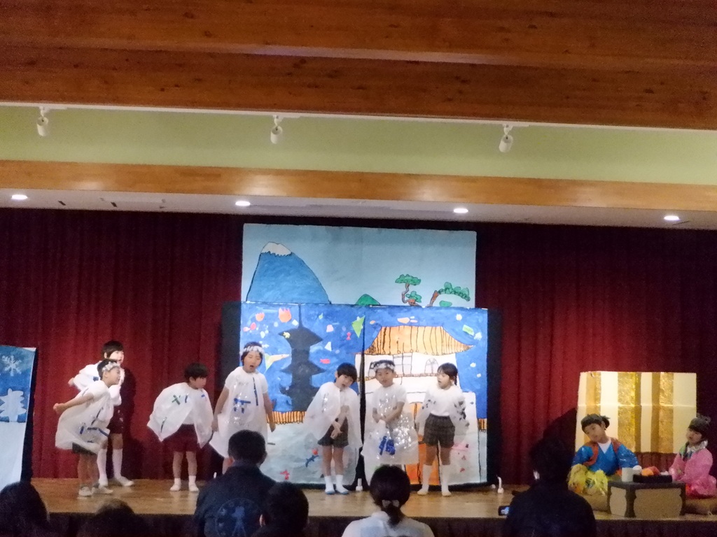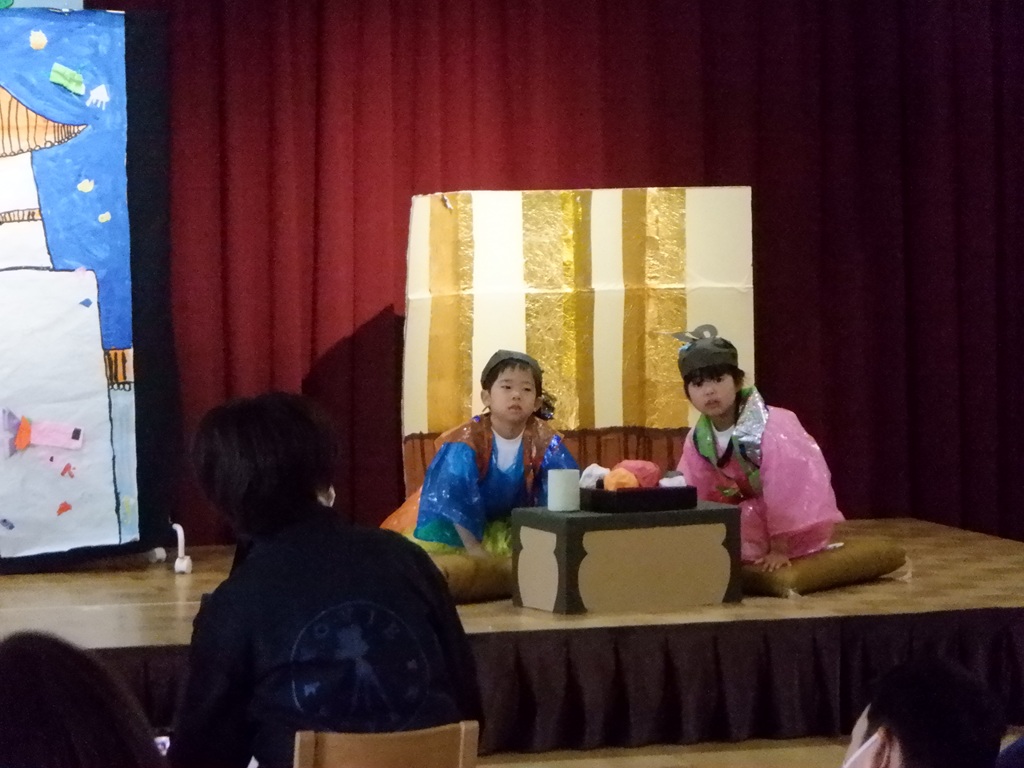 いよいよ劇の始まりです。今回は道具の出し入れや、衣装の着替えも自分たちで行いました。元気いっぱいの声で挨拶をすると、会場に大きな拍手が沸き上がります。