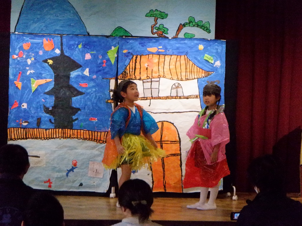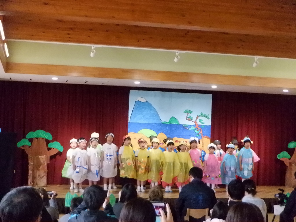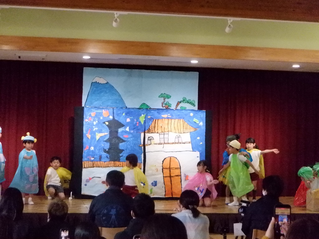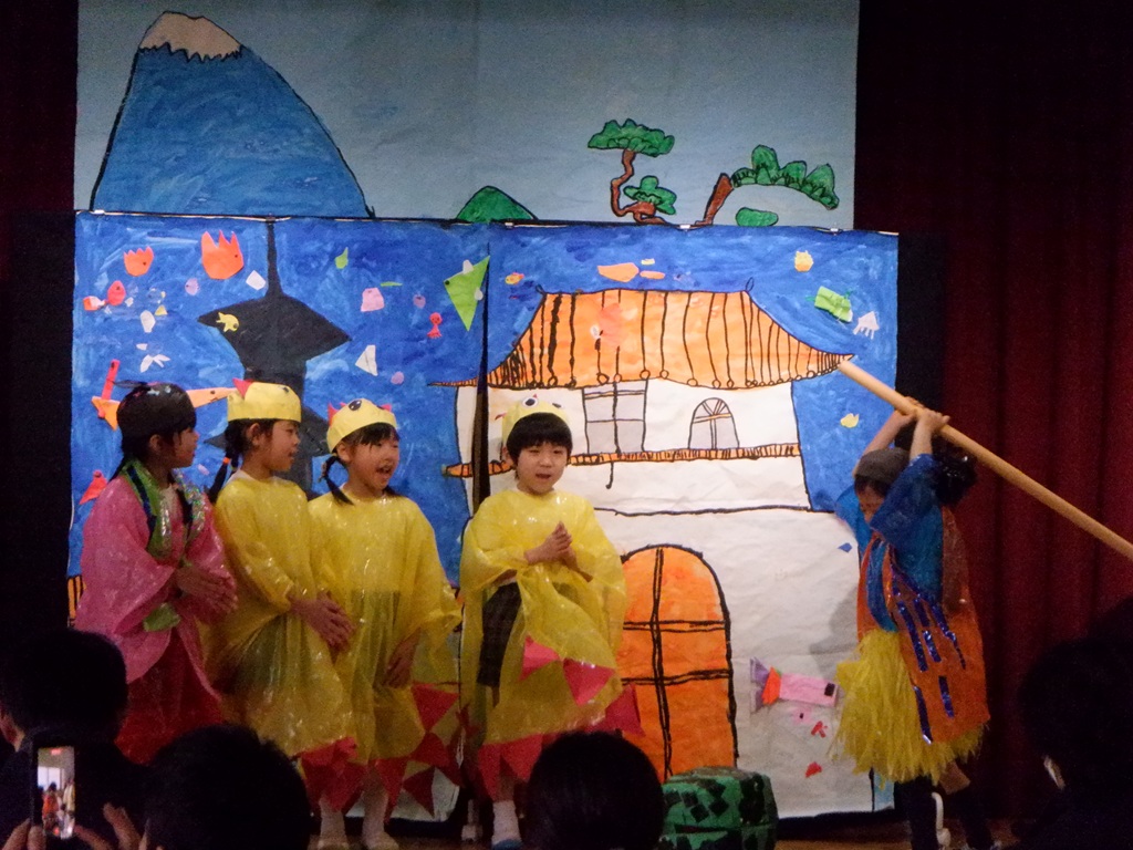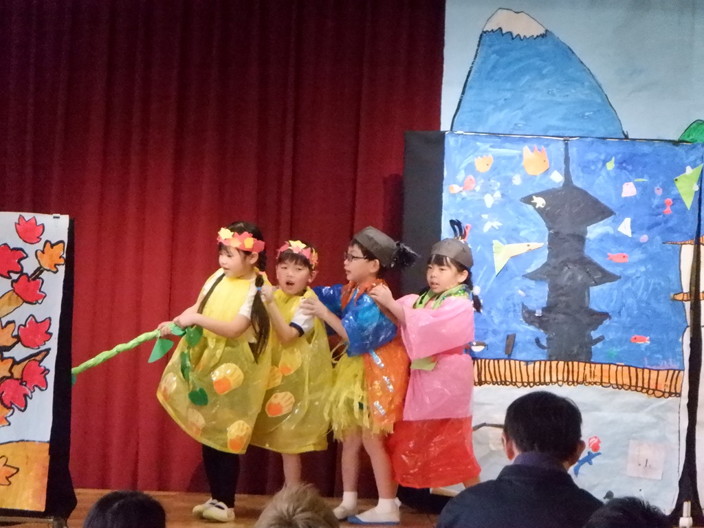いよいよ劇の始まりです。今回は道具の出し入れや、衣装の着替えも自分たちで行いました。元気いっぱいの声で挨拶をすると、会場に大きな拍手が沸き上がります。