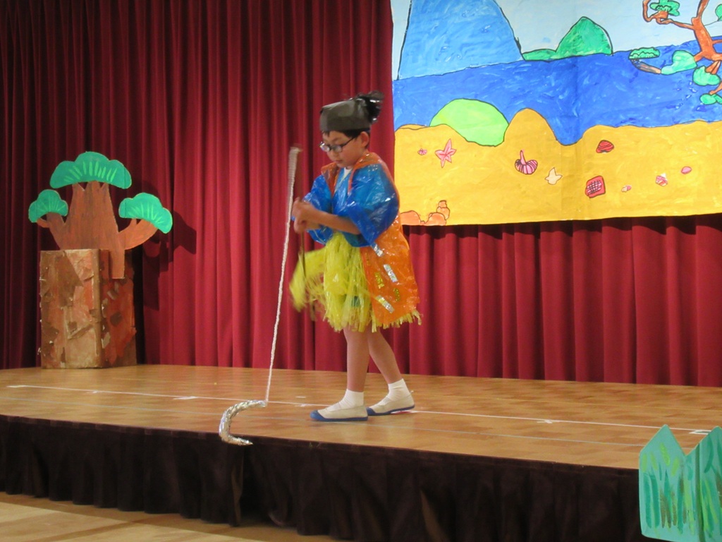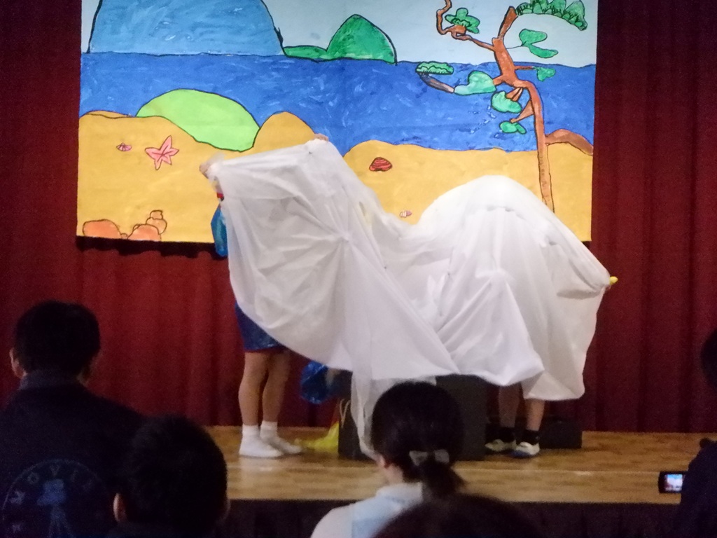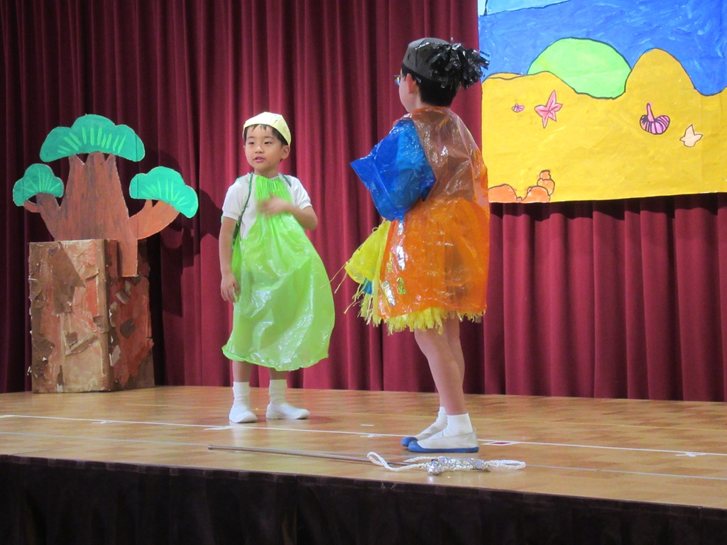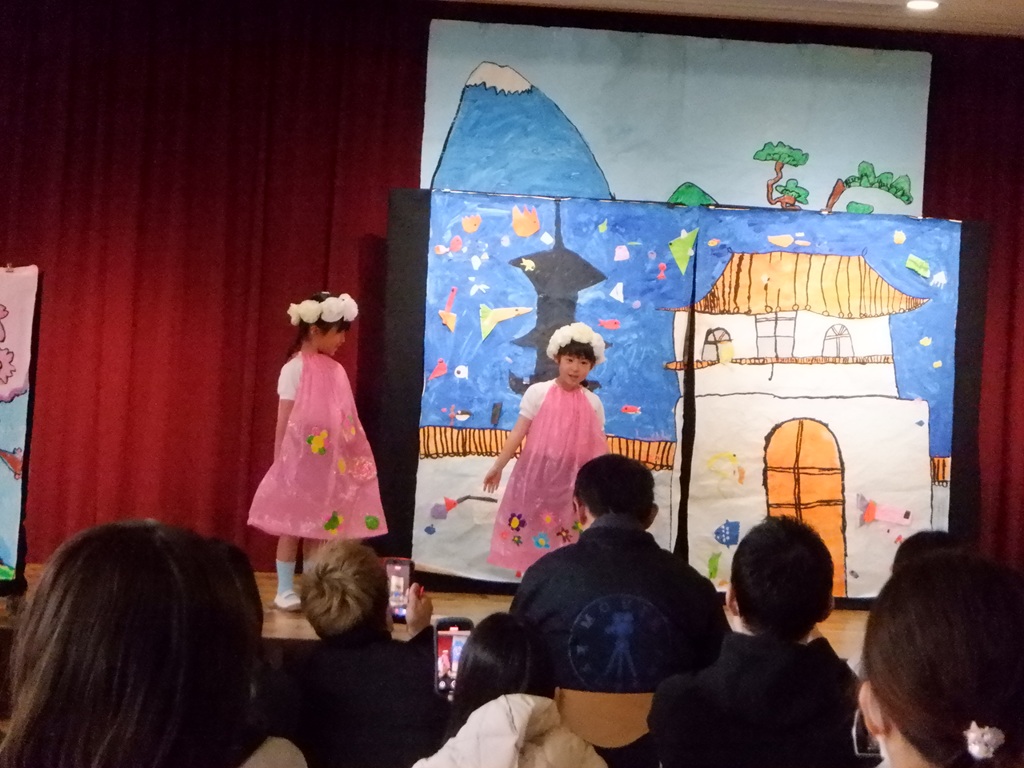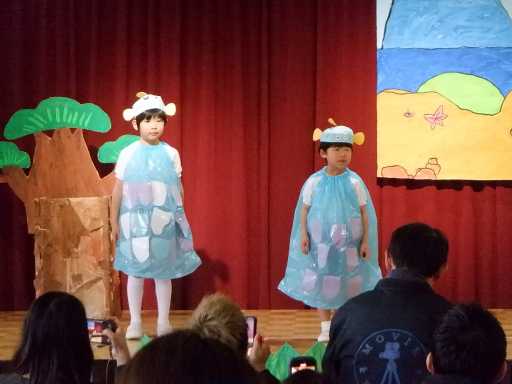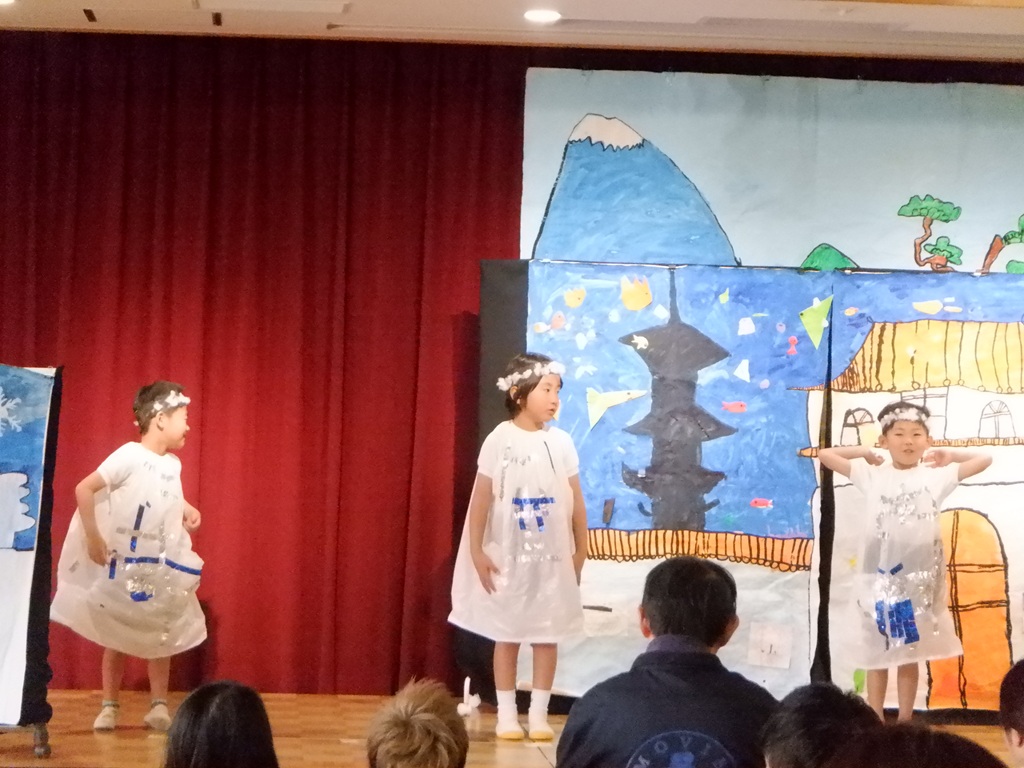 いよいよ劇の始まりです。今回は道具の出し入れや、衣装の着替えも自分たちで行いました。元気いっぱいの声で挨拶をすると、会場に大きな拍手が沸き上がります。