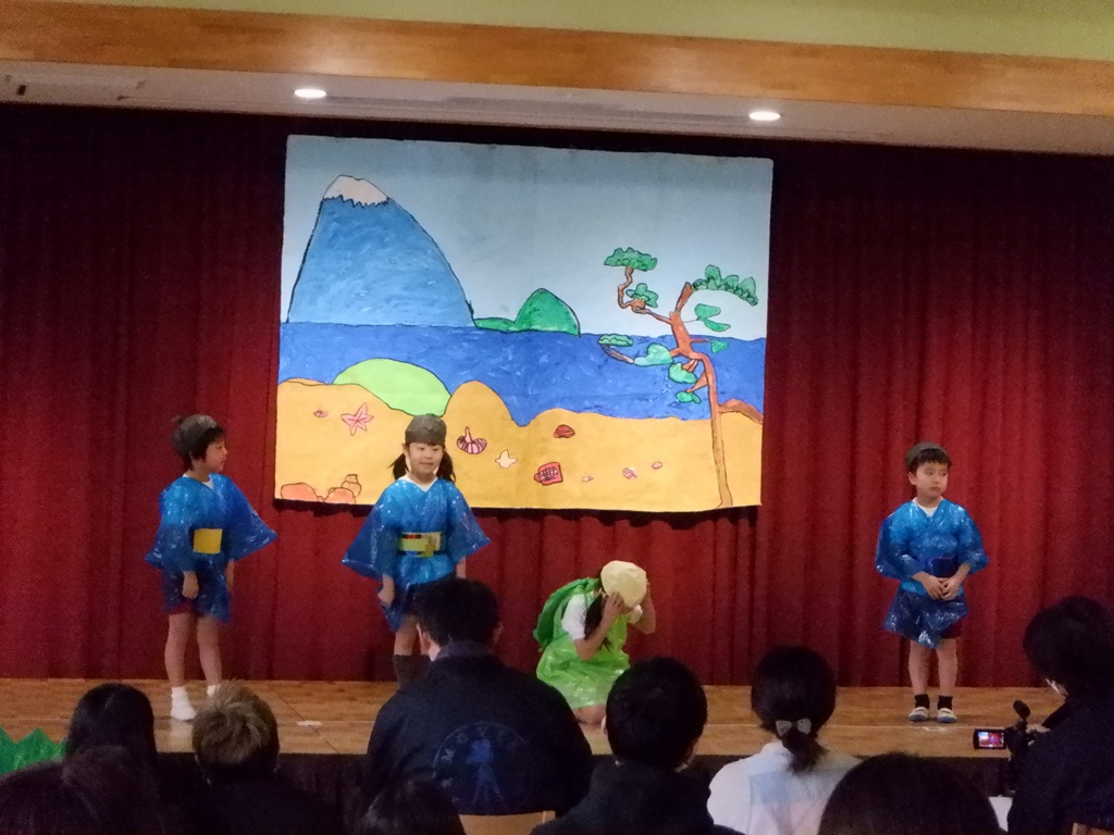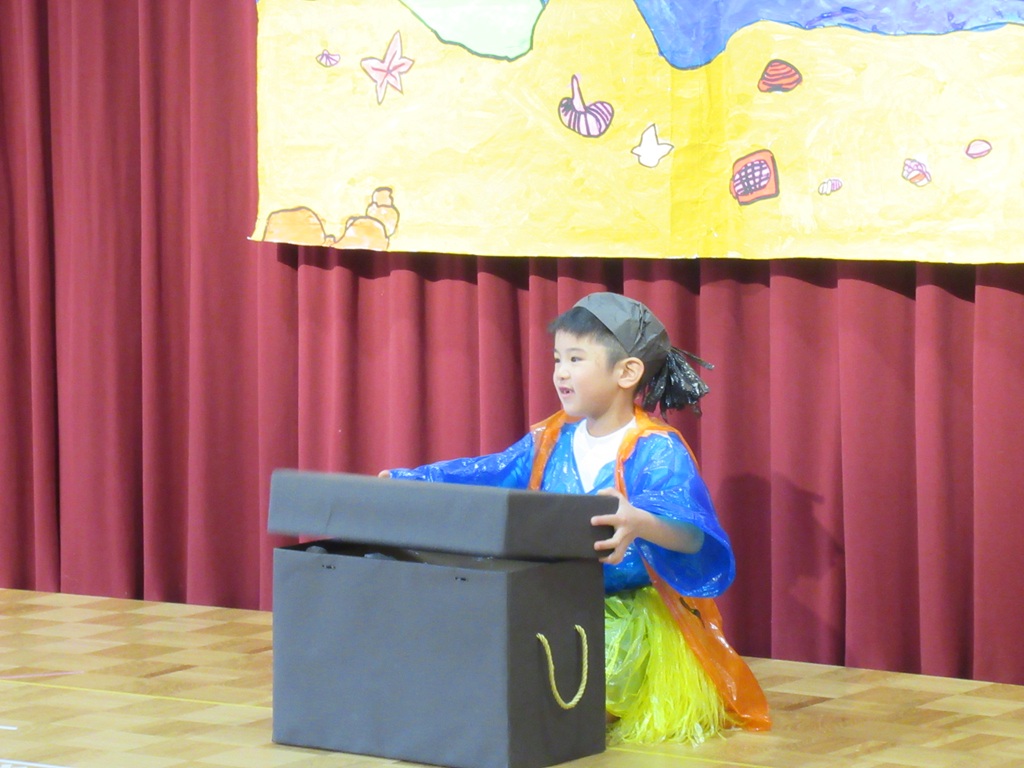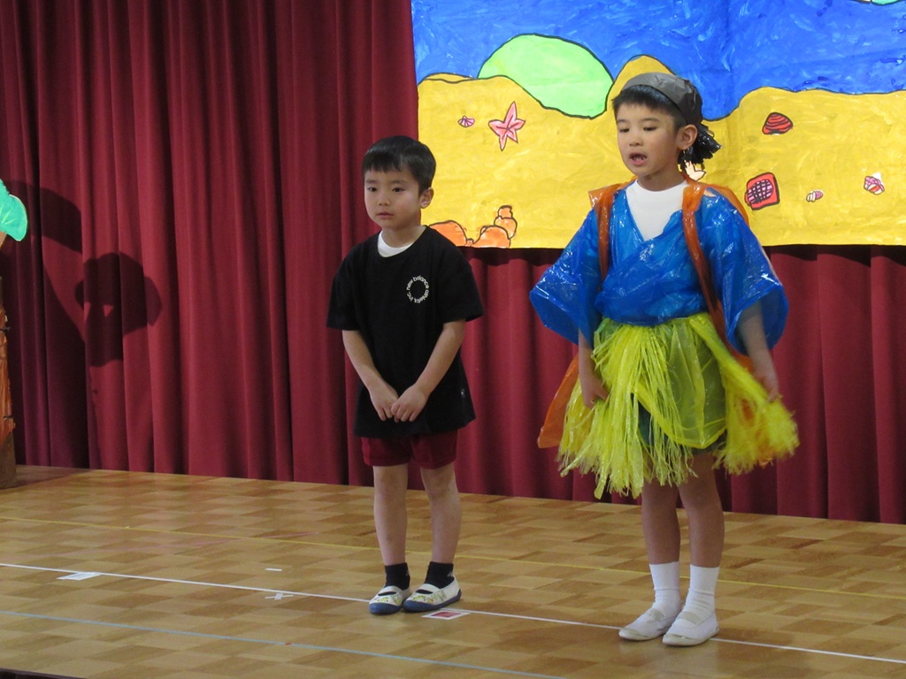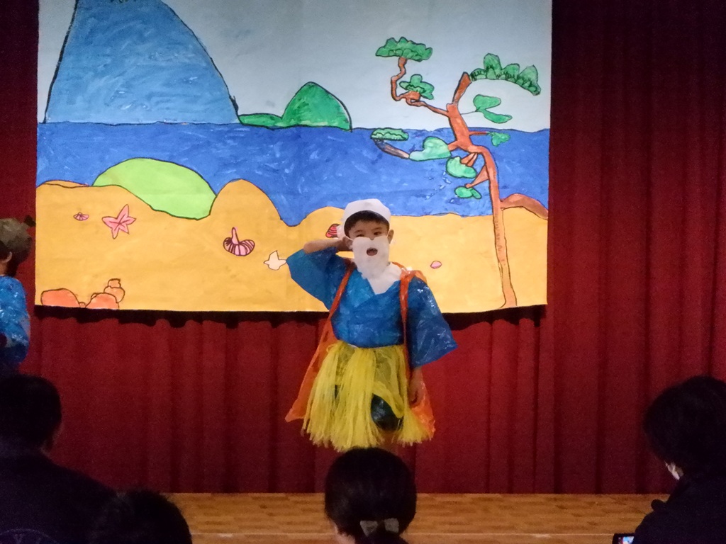 今日は待ちに待った参観日です。めろん組の子どもたちは、何日も前からこの日が来るのを楽しみにしていました。『うらしまたろう』の劇を、今度はみんな揃ってするところを見てもらおうと、張り切って練習していたからです。
