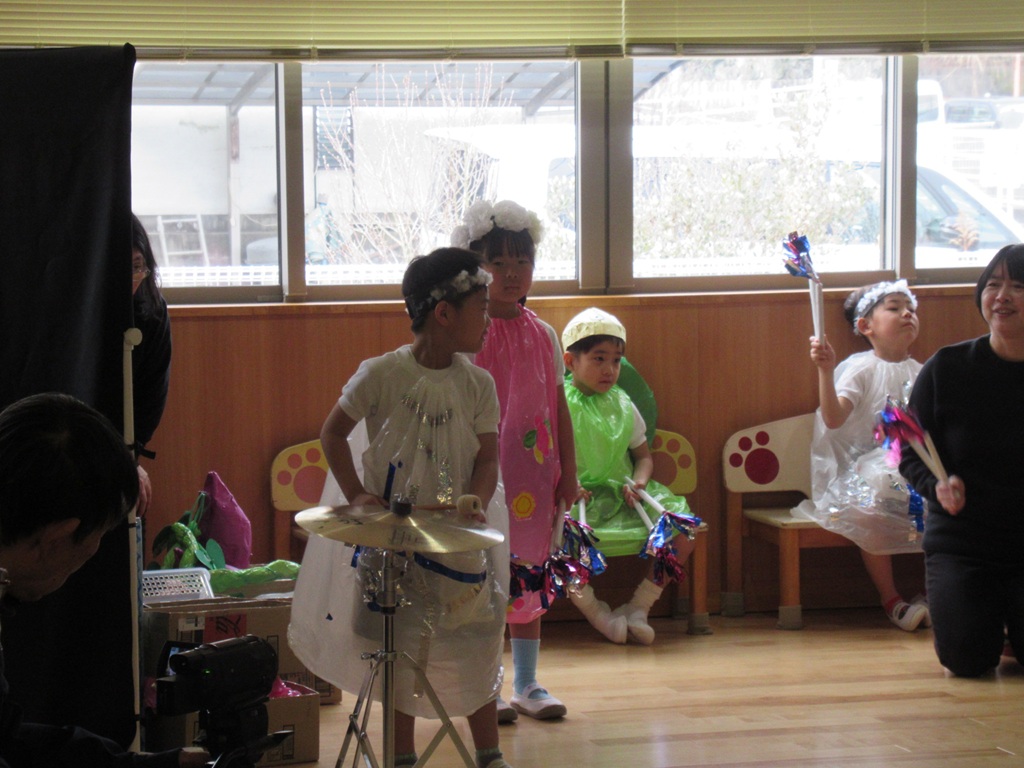 劇を引き立ててくれる効果音も子どもたちが担当しました。友達の動きを見ながらタイミングよく楽器を鳴らしました。