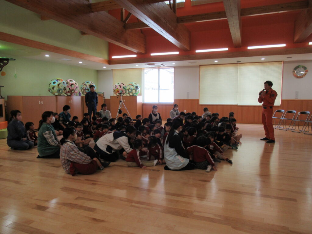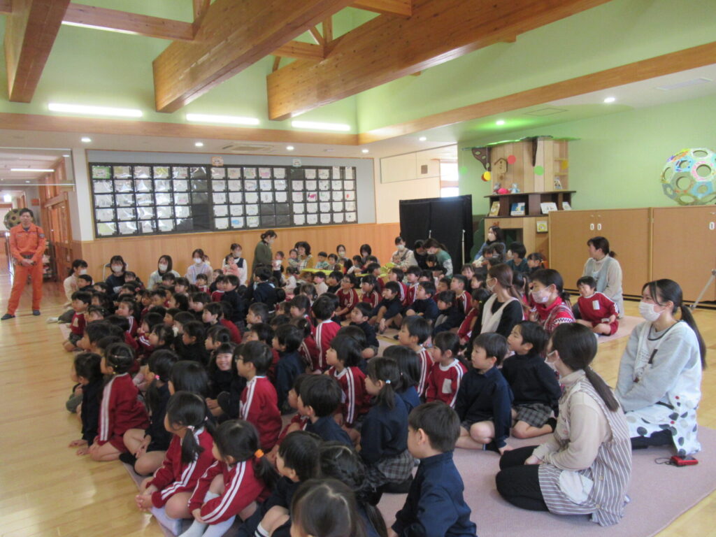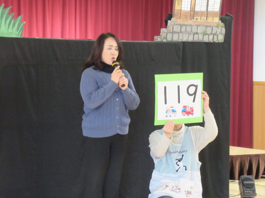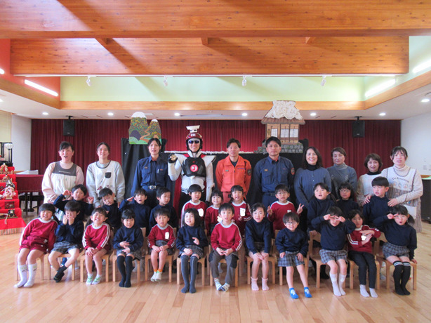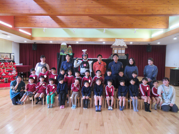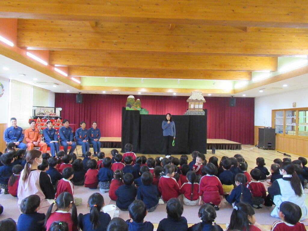 総社消防署の人形劇団の『119(ワンワンナイン)』の方が「幼児防火教室」に来てくださいました。消防車クイズや、火事の時の逃げ方の『お・は・し・も』のお話や住警器の大切さ、また人形劇で「子どもの火遊びについて」のお話をしてくれました。