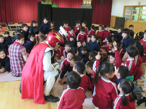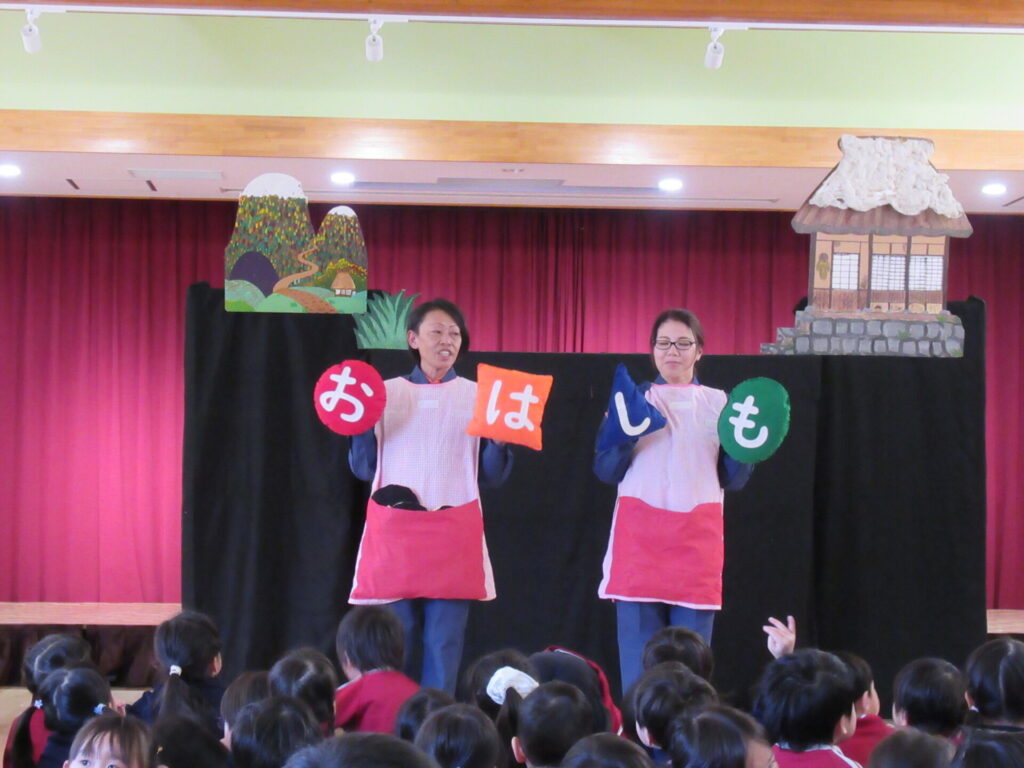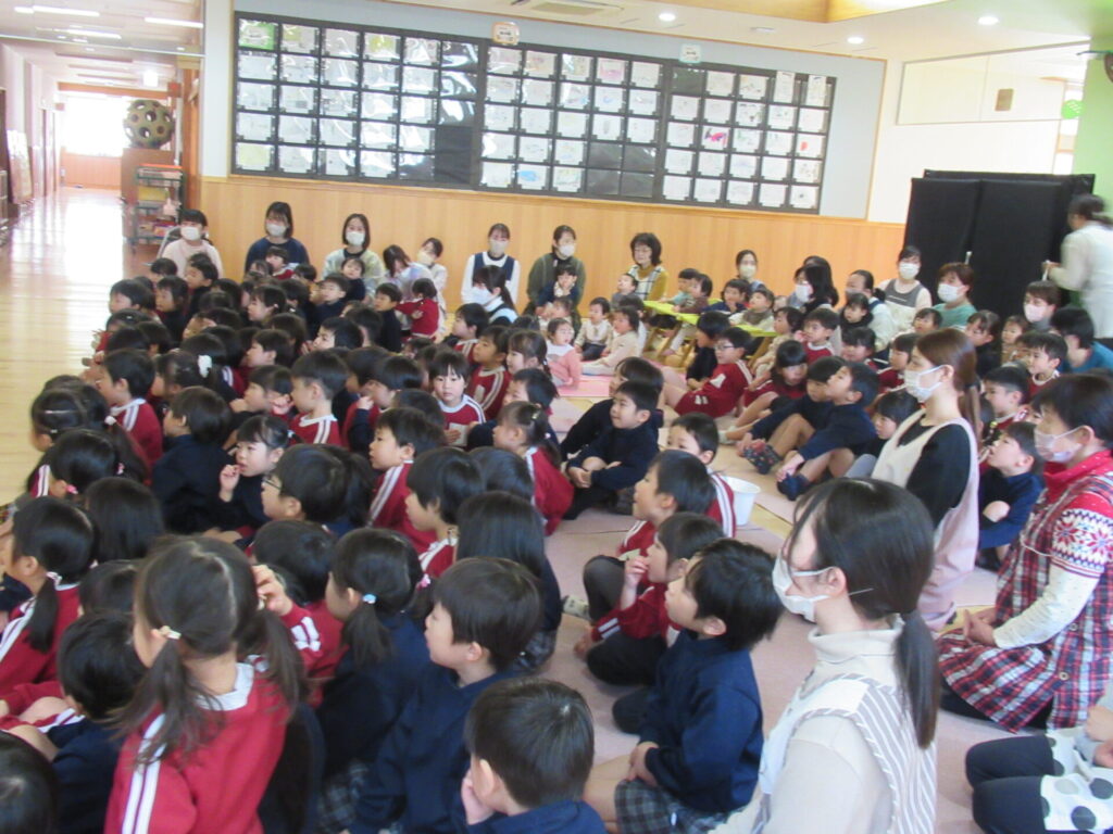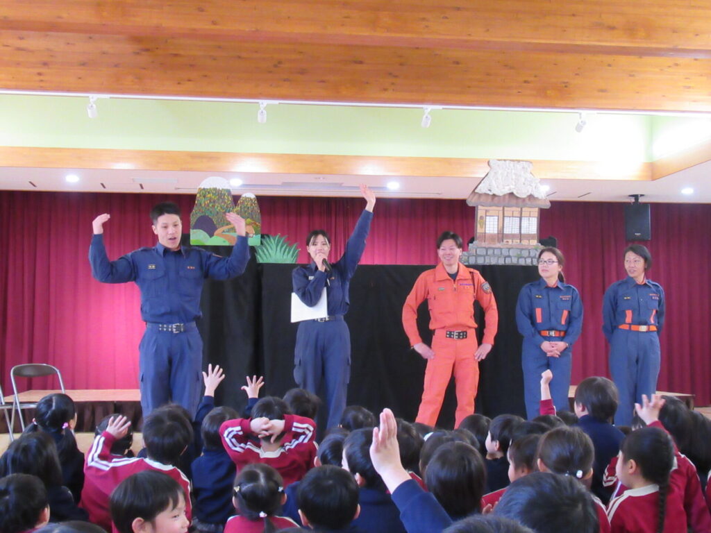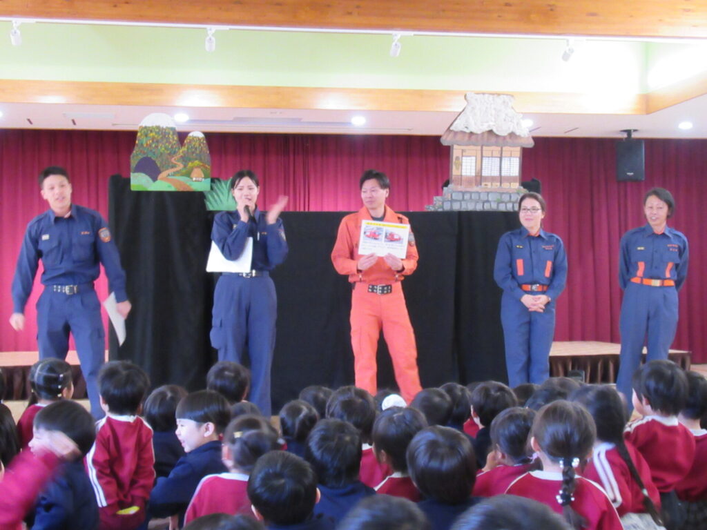総社消防署の人形劇団の『119(ワンワンナイン)』の方が「幼児防火教室」に来てくださいました。消防車クイズや、火事の時の逃げ方の『お・は・し・も』のお話や住警器の大切さ、また人形劇で「子どもの火遊びについて」のお話をしてくれました。