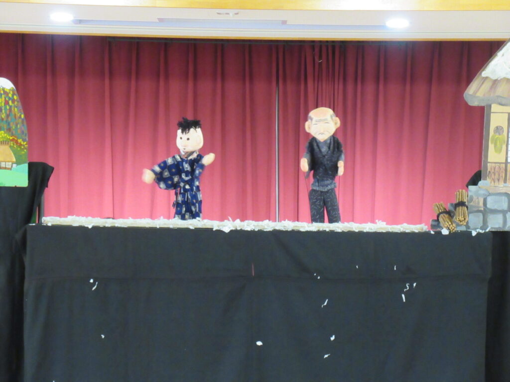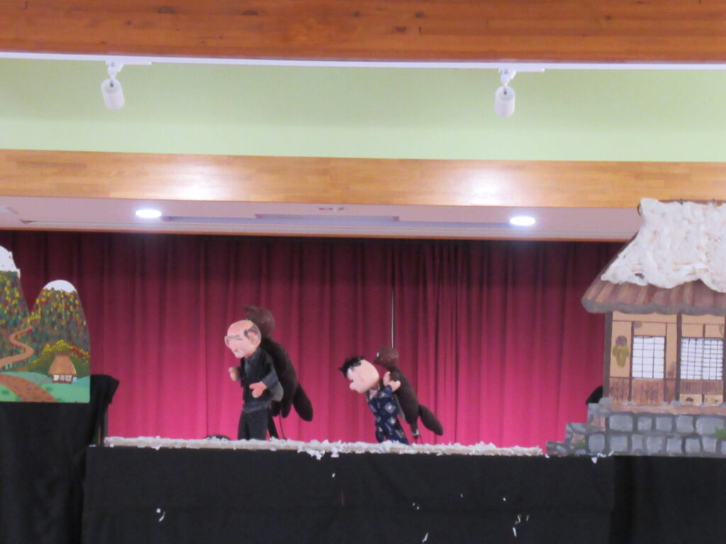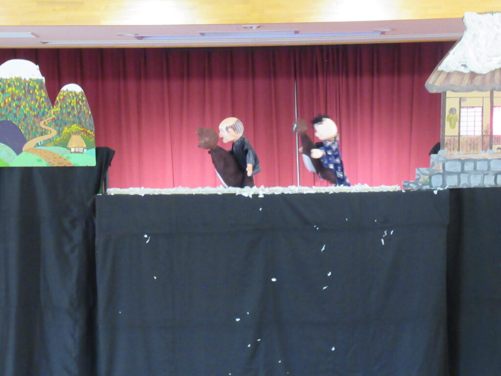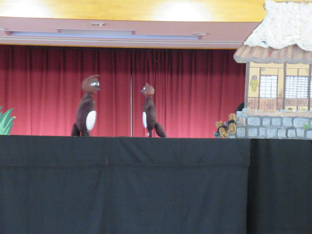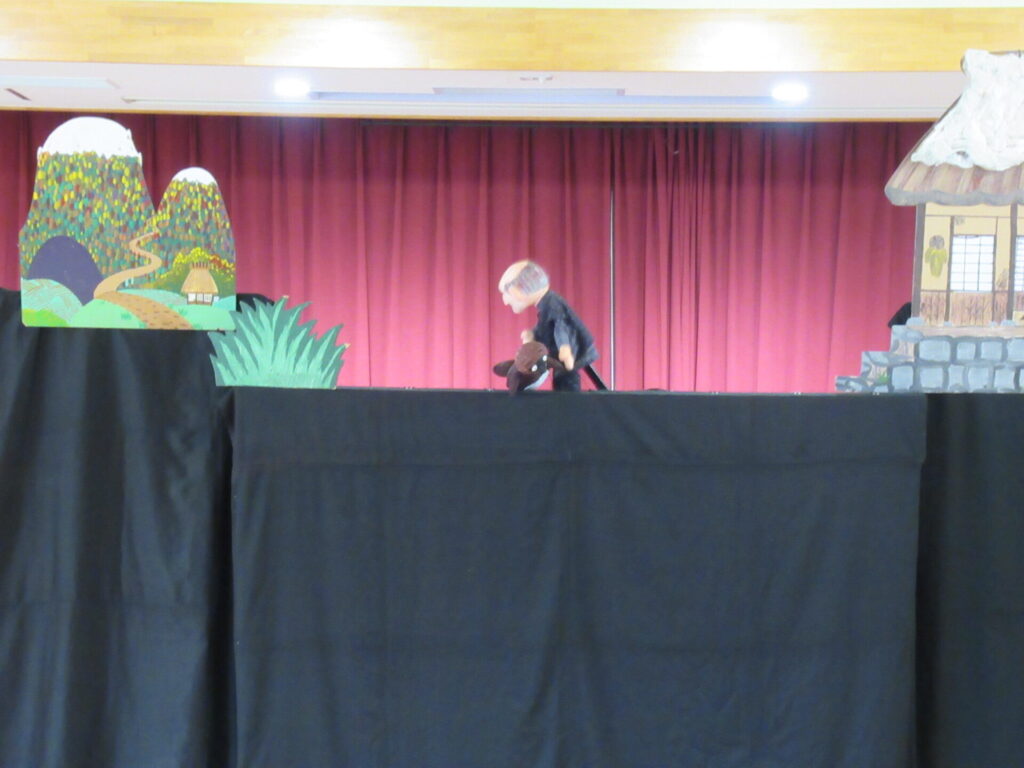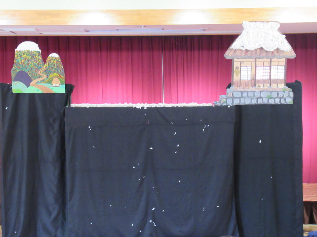 人形劇『たぬきのおんがえし』のお話では、火事の恐ろしさを知りました。ある日、罠にかかった子タヌキをたすけたおじいさん。その日は、思うように薪が拾えませんでした。タヌキのお母さんは、おじいさんに申し訳ないと思い、薪を子タヌキと一緒におじいさんの家に運びました。次の日は、雪が降っていてとても寒い日でした。
